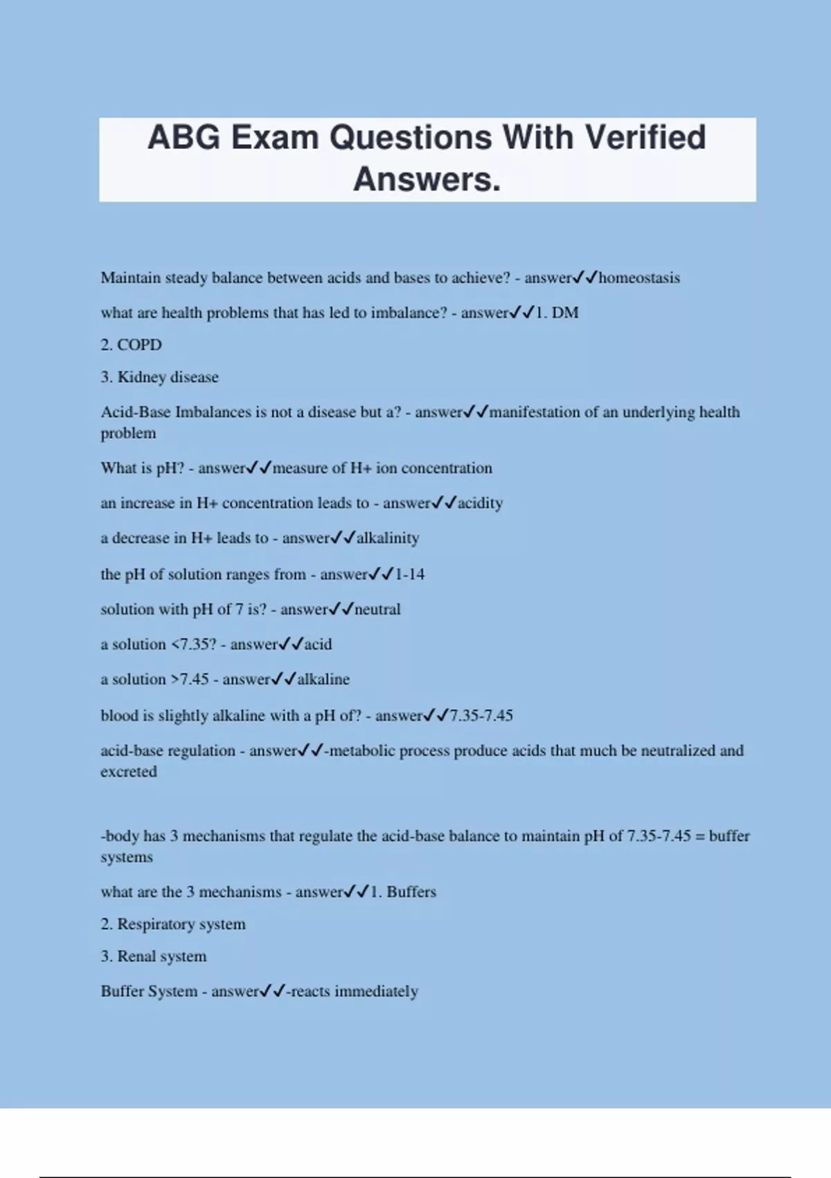 ABG Exam Questions With Verified Answers. Maintain steady balance between acids and bases to achieve? - answerhomeostasis what are health problems that has led to imbalance? - answer1. DM 2. COPD 3. Kidney disease Acid-Base Imbalances is not a disease but a? - answermanifestation of an underlying health problem What is pH? - answermeasure of H+ ion concentration an increase in H+ concentration leads to - answeracidity a decrease in H+ leads to - answeralkalinity the pH of solution ranges from - answer1-14 solution with pH of 7 is? - answerneutral a solution <7.35? - answeracid a solution >7.45 - answeralkaline blood is slightly alkaline with a pH of? - answer7.35-7.45 acid-base regulation - answer-metabolic process produce acids that much be neutralized and excreted -body has 3 mechanisms that regulate the acid-base balance to maintain pH of 7.35-7.45 = buffer systems what are the 3 mechanisms - answer1. Buffers 2. Respiratory system 3. Renal system Buffer System - answer-reacts immediately -act chemically to change strong acids to weak acids or to bind acids to neutralize effect -primary regulator of acid-base balance what is the major buffer system of ECF - answer-carbonic acid-bicarbonate other buffers? - answer-Phosphate -PRO -hemoglobin -the cell can also act as buffer by shifting H+ in and out of cell wall. when ECF of + is increased, the H+ enters the cell in exchange for K+ (this is why *alkalosis can causes hypokalemia*) buffers cannot maintain pH w/o adequate functioning of? - answer1. Resp system 2. renal system H2CO3 - answercarbonic acid HCO3- - answerbicarbonate Carbonic Acid (H2CO3)/Bicarbonate (HCO3) - answerHCL + NaH2CO3 --> NaCl + H2CO3 -in this way, combining a strong acid + strong base = prevents acid from making a large decrease in blood pH -the carbonic acid is broken down to H2O and CO2 -the lungs excrete CO2 either with insensible H2O or as carbonic acid or alone -in this process, buffer system maintains 20:1 ratio b/w bicarb and carbonic acid and normal pH slide 8 - answer Respiratory System Regulation - answerCO2 + H20 --> H2CO3 -->H+HCO3- -when released into circulation, CO2 enters RBC and combines with H2o to form H2CO3; this carbonic acid dissocates into H ions and bicarb. free H is buffered by hemoglobin molecules and