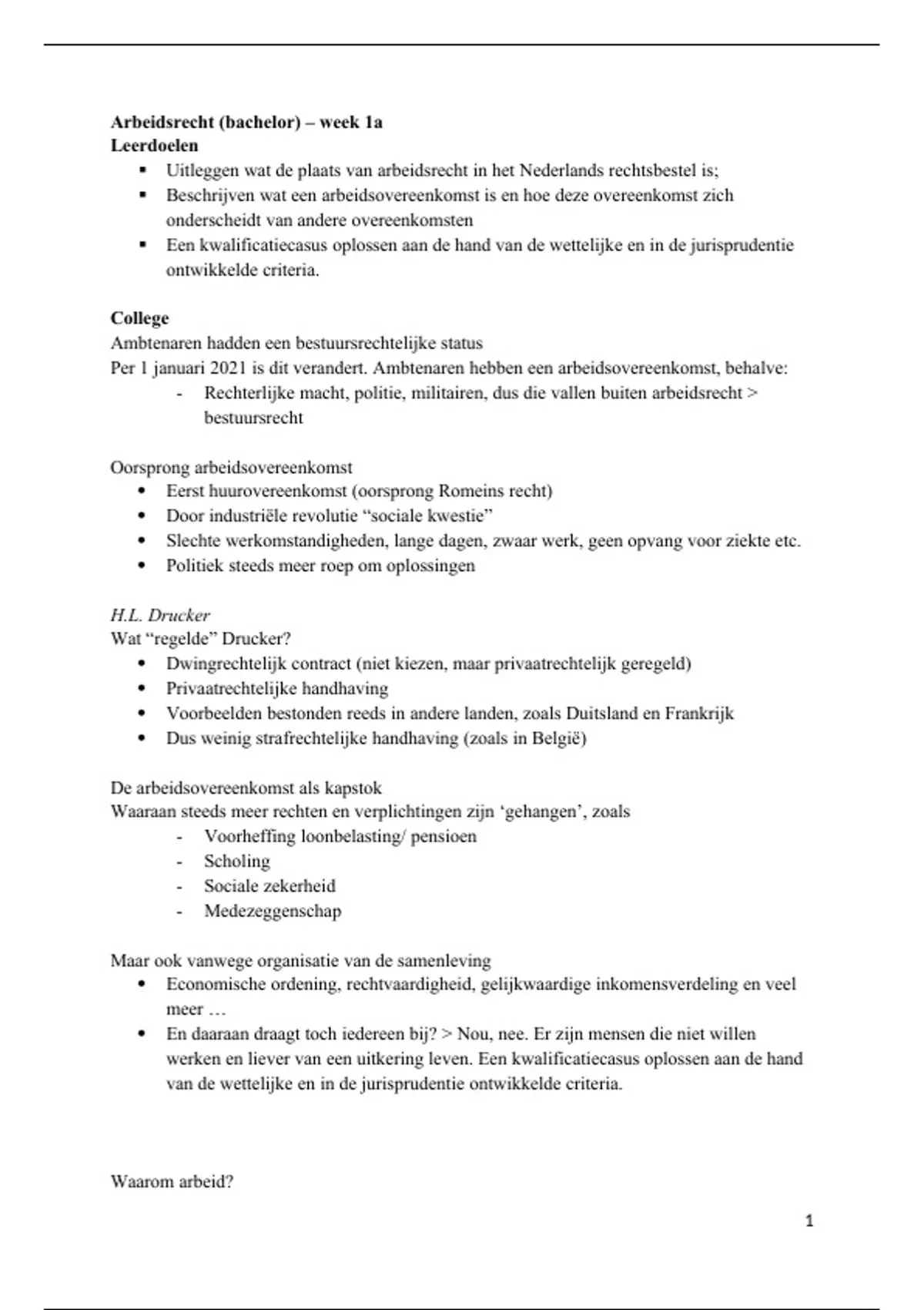 Samenvatting Arbeidsrecht week 1a - arbeidsovereenkomst
