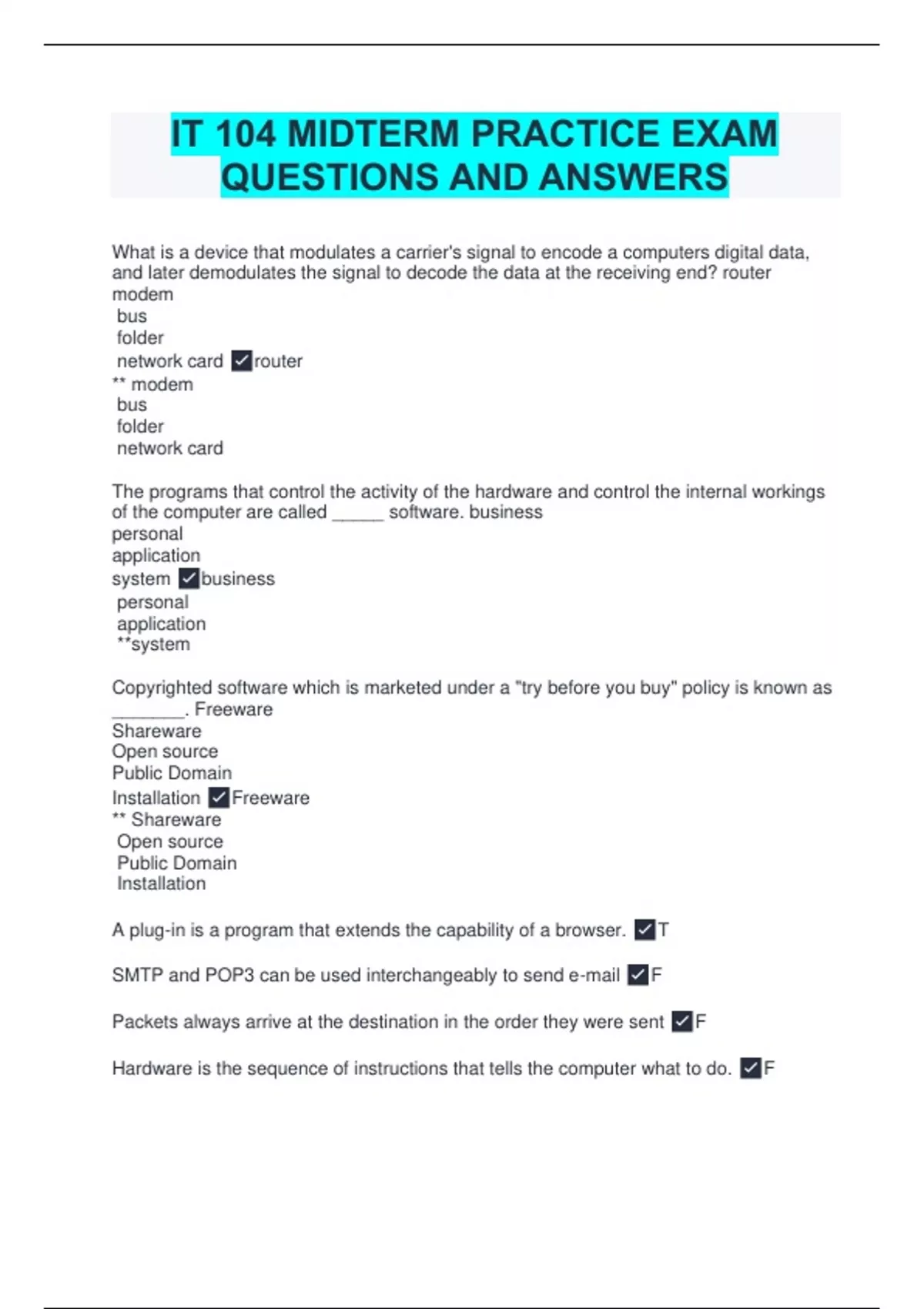 What is a device that modulates a carrier's signal to encode a computers digital data, and later demodulates the signal to decode the data at the receiving end? router modem bus folder network card router ** modem bus folder network card The programs that control the activity of the hardware and control the internal workings of the computer are called _____ software. business personal application system business personal application **system Copyrighted software which is marketed under a "try before you buy" policy is known as _______. Freeware Shareware Open source Public Domain Installation Freeware ** Shareware Open source Public Domain Installation A plug-in is a program that extends the capability of a browser. T SMTP and POP3 can be used interchangeably to send e-mail F Packets always arrive at the destination in the order they were sent F Hardware is the sequence of instructions that tells the computer what to do. F