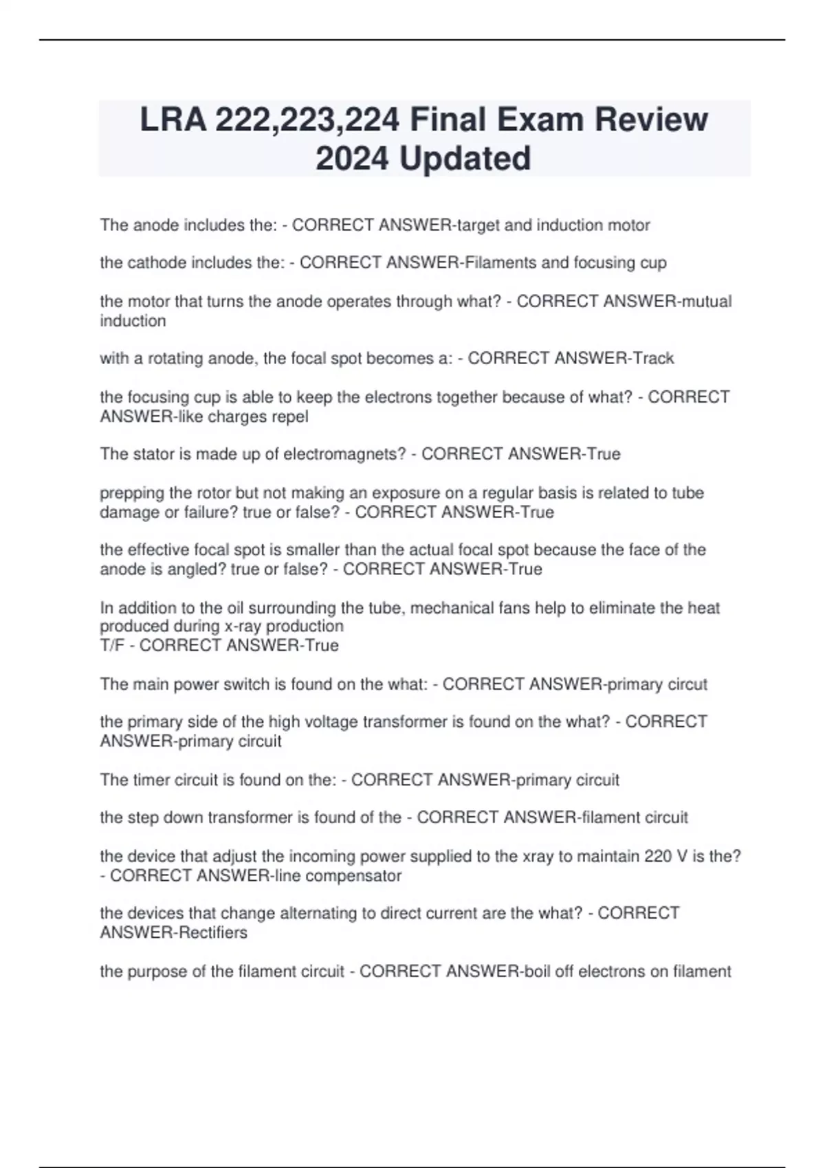 LRA 222,223,224 Final Exam Review 2024 Updated The anode includes the: - CORRECT ANSWER-target and induction motor the cathode includes the: - CORRECT ANSWER-Filaments and focusing cup the motor that turns the anode operates through what? - CORRECT ANSWER-mutual induction with a rotating anode, the focal spot becomes a: - CORRECT ANSWER-Track the focusing cup is able to keep the electrons together because of what? - CORRECT ANSWER-like charges repel The stator is made up of electromagnets? - CORRECT ANSWER-True prepping the rotor but not making an exposure on a regular basis is related to tube damage or failure? true or false? - CORRECT ANSWER-True the effective focal spot is smaller than the actual focal spot because the face of the anode is angled? true or false? - CORRECT ANSWER-True In addition to the oil surrounding the tube, mechanical fans help to eliminate the heat produced during x-ray production T/F - CORRECT ANSWER-True The main power switch is found on the what: - CORRECT ANSWER-primary circut the primary side of the high voltage transformer is found on the what? - CORRECT ANSWER-primary circuit The timer circuit is found on the: - CORRECT ANSWER-primary circuit the step down transformer is found of the - CORRECT ANSWER-filament circuit the device that adjust the incoming power supplied to the xray to maintain 220 V is the? - CORRECT ANSWER-line compensator the devices that change alternating to direct current are the what? - CORRECT ANSWER-Rectifiers the purpose of the filament circuit - CORRECT ANSWER-boil off electrons on filament the primary purpose of the step down transformer is to - CORRECT ANSWER-increase amperage going to filament to produce xrays a cloud of electrons is neccessary and the cathode must have a strong positive charge? - CORRECT ANSWER-false