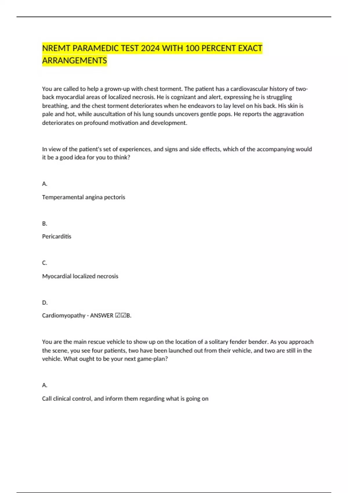 NREMT PARAMEDIC TEST 2024 WITH 100 PERCENT EXACT ARRANGEMENTS You are called to help a grown-up with chest torment. The patient has a cardiovascular history of two-back myocardial areas of localized necrosis. He is cognizant and alert, expressing he is struggling breathing, and the chest torment deteriorates when he endeavors to lay level on his back. His skin is pale and hot, while auscultation of his lung sounds uncovers gentle pops. He reports the aggravation deteriorates on profound motivation and development. In view of the patient's set of experiences, and signs and side effects, which of the accompanying would it be a good idea for you to think? A. Temperamental angina pectoris B. Pericarditis C.