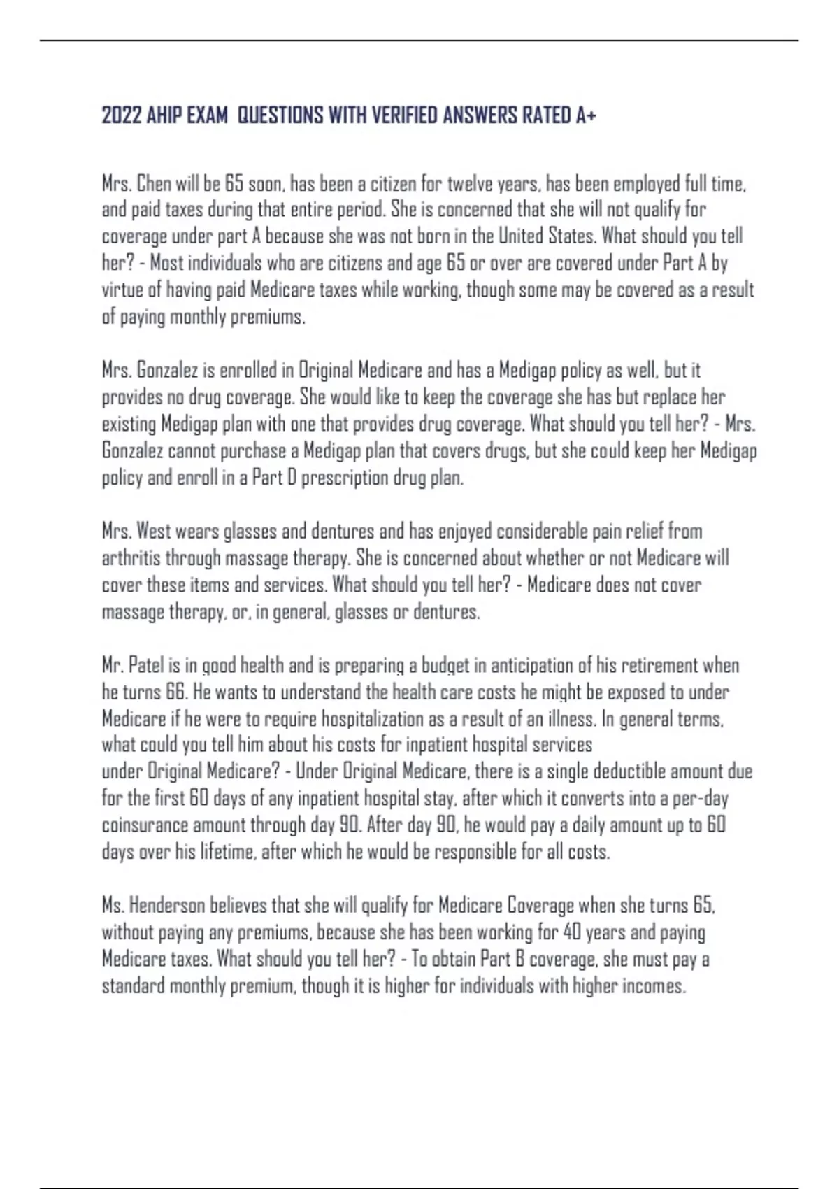 2022 AHIP EXAM QUESTIONS WITH VERIFIED ANSWERS RATED A+ Mrs. Chen will be 65 soon, has been a citizen for twelve years, has been employed full time, and paid taxes during that entire period. She is concerned that she will not qualify for coverage under part A because she was not born in the United States. What should you tell her? - Most individuals who are citizens and age 65 or over are covered under Part A by virtue of having paid Medicare taxes while working, though some may be covered as a result of paying monthly premiums. Mrs. Gonzalez is enrolled in Original Medicare and has a Medigap policy as well, but it provides no drug coverage. She would like to keep the coverage she has but replace her existing Medigap plan with one that provides drug coverage. What should you tell her? - Mrs. Gonzalez cannot purchase a Medigap plan that covers drugs, but she could keep her Medigap policy and enroll in a Part D prescription drug plan. Mrs. West wears glasses and dentures and has enjoyed considerable pain relief from arthritis through massage therapy. She is concerned about whether or not Medicare will cover these items and services. What should you tell her? - Medicare does not cover massage therapy, or, in general, glasses or dentures. Mr. Patel is in good health and is preparing a budget in anticipation of his retirement when he turns 66. He wants to understand the health care costs he might be exposed to under Medicare if he were to require hospitalization as a result of an illness. In general terms, what could you tell him about his costs for inpatient hospital services under Original Medicare? - Under Original Medicare, there is a single deductible amount due for the first 60 days of any inpatient hospital stay, after which it converts into a per-day coinsurance amount through day 90. After day 90, he would pay a daily amount up to 60 days over his lifetime, after which he would be responsible for all costs. Ms. Henderson believes that she will qualify for Medicare Coverage when she turns 65, without paying any premiums, because she has been working for 40 years and paying Medicare taxes. What should you tell her? - To obtain Part B coverage, she must pay a standard monthly premium, though it is higher for individuals with higher incomes. Mr. Alonso receives some help paying for his two generic prescription drugs from his employer's retiree coverage, but he wants to compare it to a Part D prescription drug plan. He asks you what costs he would generally expect to encounter when enrolling into a standard MedicarePart D prescription drug plan. What should you tell him? - He generally would pay a monthly premium, annual deductible, and per-prescription cost-sharing. Ms. Moore plans to retire when she turns 65 in a few months. She is in excellent health and will have considerable income when she retires. She is concerned that her income will make it impossible for her to qualify for Medicare. What could you tell her to address her concern? - Medicare is a program for people age 65 or older and those under age 65 with certain disabilities, end-stage renal disease, and Lou Gehrig's disease so she will be eligible for Medicare. Mr. Xi will soon turn age 65 and has come to you for advice as to what services are provided under Original Medicare. What should you tell Mr. Xi that best describes the health coverage provided to Medicare beneficiaries? - Beneficiaries under Original Medicare have no costsharing for most preventive services which include immunizations such as annual flu shots. Mrs. Duarte is enrolled in Original Medicare Parts A and B. She has recently reviewed her Medicare Summary Notice (MSN) and disagrees with a determination that partially denied one of her claims for services. What advice would you give her? - Mrs. Duarte should file an appeal of this initial determination within 120 days of the date she received the MSN in the mail. Mr. Capadona would like to purchase a Medicare Advantage (MA) plan and a Medigap plan to pick up costs not covered by that plan. What should you tell him? - It is illegal for you to sell Mr. Capadona a Medigap plan if he is enrolled in an MA plan, and besides, Medigap only works with Original Medicare. Mr. Davis is 52 years old and has recently been diagnosed with end-stage renal disease (ESRD) and will soon begin dialysis. He is wondering if he can obtain coverage under Medicare. What should you tell him? - He may sign-up for Medicare at any time however coverage usually begins on the fourth month after dialysis treatments start. Juan Perez, who is turning age 65 next month, intends to work for several more years at Smallcap, Incorporated. Smallcap has a workforce of15 employees and offers employersponsored healthcare coverage. Juan is a naturalized citizen and has contributed to the Medicare system for over 20 years. Juan asks you if he will be entitled to Medicare and if he enrolls how that will impact his employer-sponsored healthcare coverage. How would you respond? -Juan is likely to be eligible for Medicare once he turns age 65 and if he enrolls Medicare would become the primary payor of his healthcare claims and Smallcap does not have to continue to offer him coverage comparable to those under age 65 under its employer-sponsored group health plan.