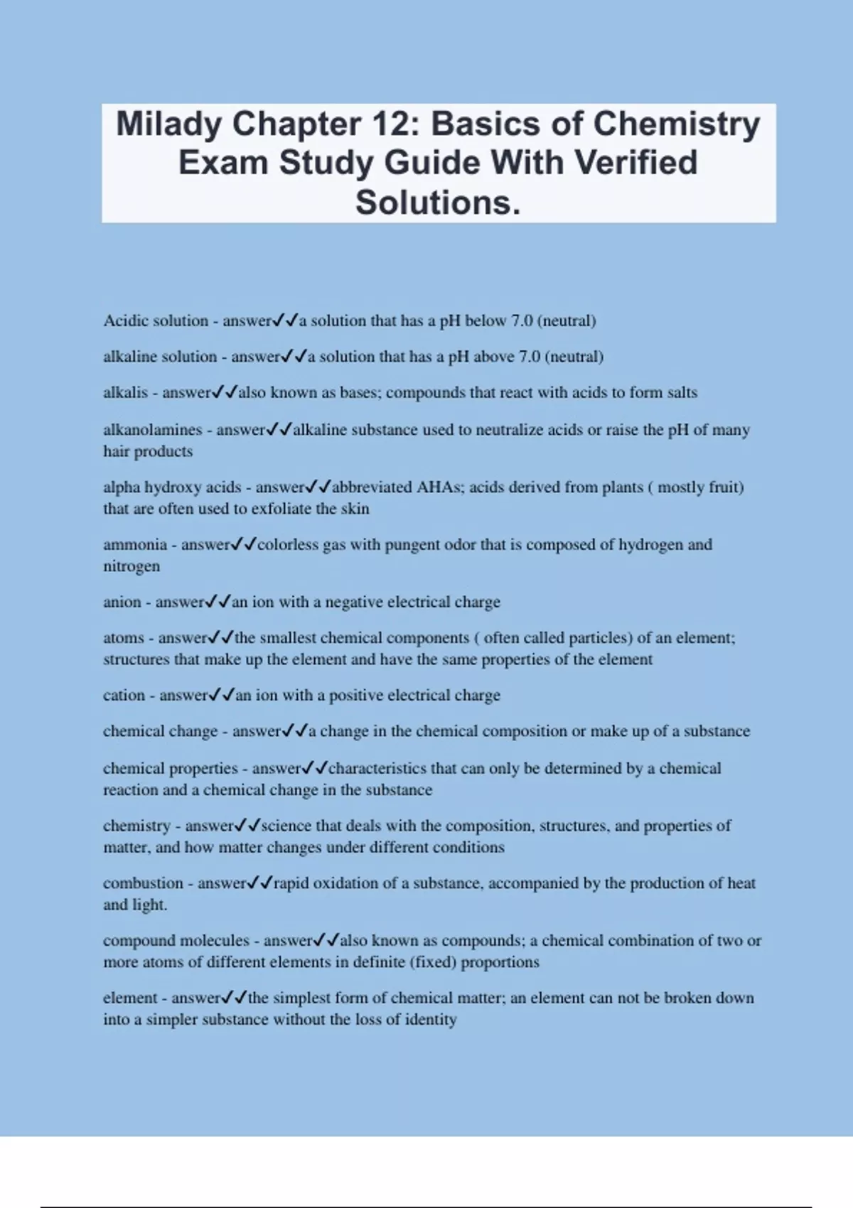 Milady Chapter 12: Basics of Chemistry Exam Study Guide With Verified Solutions. Acidic solution - answera solution that has a pH below 7.0 (neutral) alkaline solution - answera solution that has a pH above 7.0 (neutral) alkalis - answeralso known as bases; compounds that react with acids to form salts alkanolamines - answeralkaline substance used to neutralize acids or raise the pH of many hair products alpha hydroxy acids - answerabbreviated AHAs; acids derived from plants ( mostly fruit) that are often used to exfoliate the skin ammonia - answercolorless gas with pungent odor that is composed of hydrogen and nitrogen anion - answeran ion with a negative electrical charge atoms - answerthe smallest chemical components ( often called particles) of an element; structures that make up the element and have the same properties of the element cation - answeran ion with a positive electrical charge chemical change - answera change in the chemical composition or make up of a substance chemical properties - answercharacteristics that can only be determined by a chemical reaction and a chemical change in the substance chemistry - answerscience that deals with the composition, structures, and properties of matter, and how matter changes under different conditions combustion - answerrapid oxidation of a substance, accompanied by the production of heat and light. compound molecules - answeralso known as compounds; a chemical combination of two or more atoms of different elements in definite (fixed) proportions element - answerthe simplest form of chemical matter; an element can not be broken down into a simpler substance without the loss of identity
