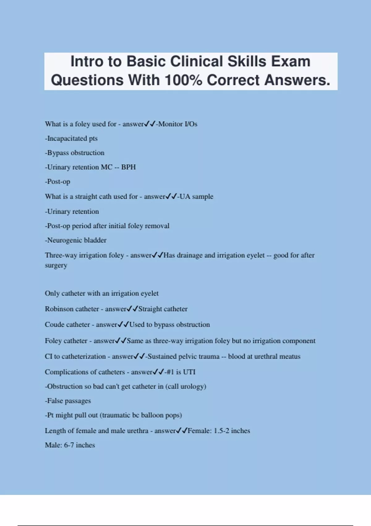 Intro to Basic Clinical Skills Exam Questions With 100% Correct Answers. What is a foley used for - answer-Monitor I/Os -Incapacitated pts -Bypass obstruction -Urinary retention MC -- BPH -Post-op What is a straight cath used for - answer-UA sample -Urinary retention -Post-op period after initial foley removal -Neurogenic bladder Three-way irrigation foley - answerHas drainage and irrigation eyelet -- good for after surgery Only catheter with an irrigation eyelet Robinson catheter - answerStraight catheter Coude catheter - answerUsed to bypass obstruction Foley catheter - answerSame as three-way irrigation foley but no irrigation component CI to catheterization - answer-Sustained pelvic trauma -- blood at urethral meatus Complications of catheters - answer-#1 is UTI -Obstruction so bad can't get catheter in (call urology) -False passages -Pt might pull out (traumatic bc balloon pops) Length of female and male urethra - answerFemale: 1.5-2 inches Male: 6-7 inches NGT indications - answer-Bowel decompression for obstruction -Sampling gastric contents (might be done in OD) -Removing gastric contents -Providing nutritional support -Prevention of reflux during surgery (to prevent aspiration pneumonia) Normal Foley size - answer16-18 F NGT CIs - answer-If pathway is obstructed -Trauma -Choanal atresia -Esophageal stricture -Zenker diverticulum -Recent esophageal or gastric surgery (like Whipple) NGT complications - answer-Nasal trauma -Incorrect placement (ie inserted into lungs) -Just can't get it in How to insert NGT - answer-Use lube -Go to 65 mark otherwise won't be in far enough -CXR to confirm placement CIs for venipuncture - answer-Areas of infection -Areas over burn, severe scars, injuries -Ipsilateral side of mastectomy -IV line on same side (use other side or go distal to it) -AV fistula (use other side) Venipuncture complications - answer-Infection of skin (cellulitis) or vein (phlebitis) -Thrombosis -laceration of vein -Hemorrhage