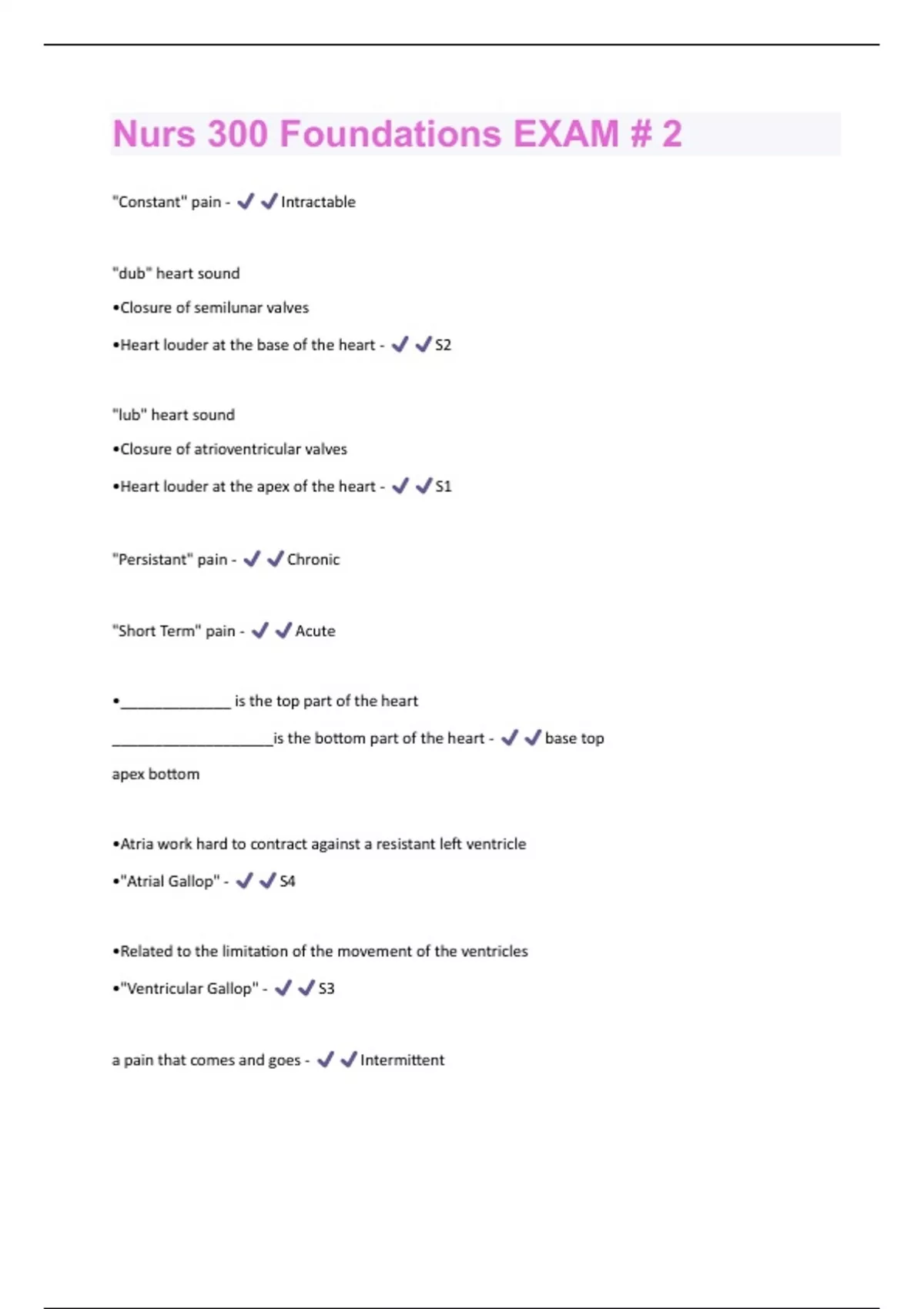 "Constant" pain - Intractable "dub" heart sound •Closure of semilunar valves •Heart louder at the base of the heart - S2 "lub" heart sound •Closure of atrioventricular valves •Heart louder at the apex of the heart - S1 "Persistant" pain - Chronic "Short Term" pain - Acute •_____________ is the top part of the heart ___________________is the bottom part of the heart - base top apex bottom •Atria work hard to contract against a resistant left ventricle •"Atrial Gallop" - S4 •Related to the limitation of the movement of the ventricles •"Ventricular Gallop" - S3 a pain that comes and goes - Intermittenta swishing or unusually prolonged sounds indicative of turbulent blood flow in the vascular system. - Heart murmurs abnormal findings while percussing the thorax? - Dullness, soft or muffled sounds Hyperresonance Broca's area unable to communicate language in written or spoken but knows what they want to say - Expressive aphasia: cerebrospinal fluid for analysis, give meds, measure pressure of CSF. - Lumbar Puncture complete impairment of comprehension and expression of verbal written. - Aphasia Cone-shaped, air-filled structure Acid-Base balance maintains blood pH - Lungs defined as sudden pain beneath the sternum, often radiating to the left shoulder and arm. - Angina Pectoris detects stenosis, aneurysms - Cerebral angiography diagnose hemorrhage, tumors, inflammatory disorders - CT scan