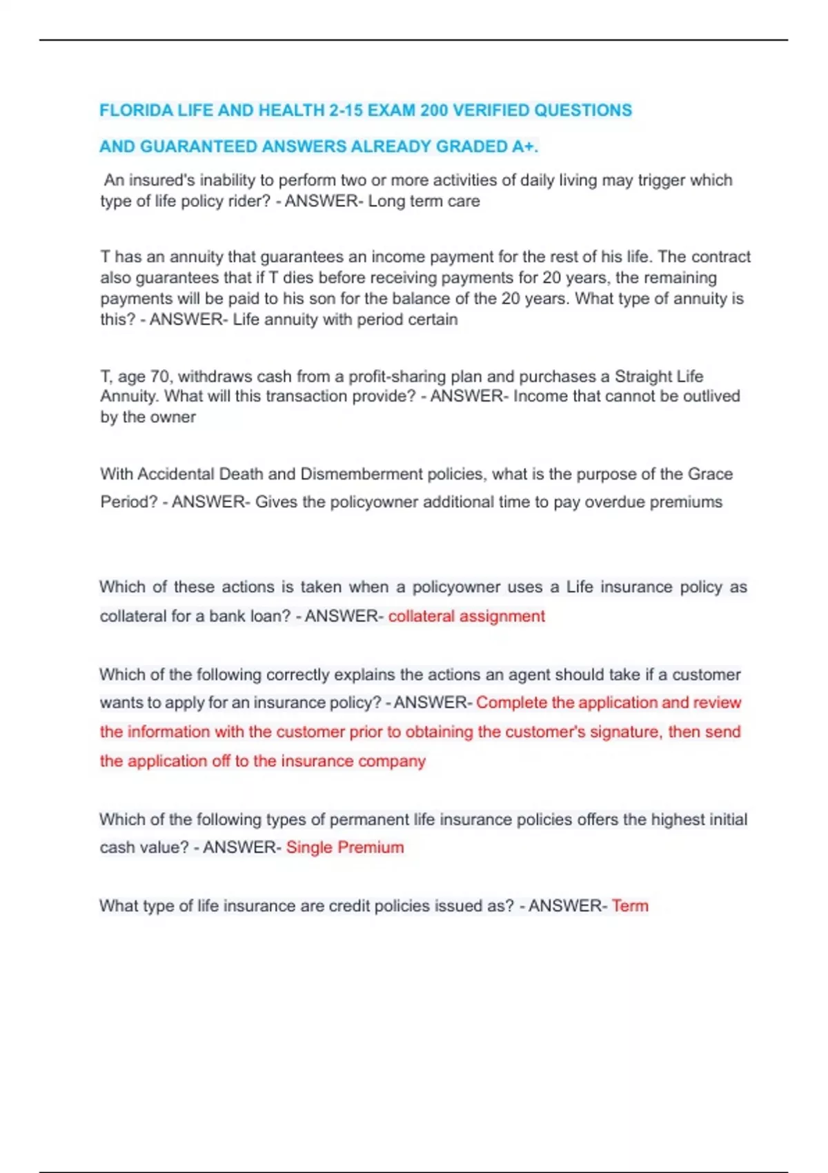 FLORIDA LIFE AND HEALTH 2-15 EXAM 200 VERIFIED QUESTIONS AND GUARANTEED ANSWERS ALREADY GRADED A+FLORIDA LIFE AND HEALTH 2-15 EXAM 200 VERIFIED QUESTIONS AND GUARANTEED ANSWERS ALREADY GRADED A+