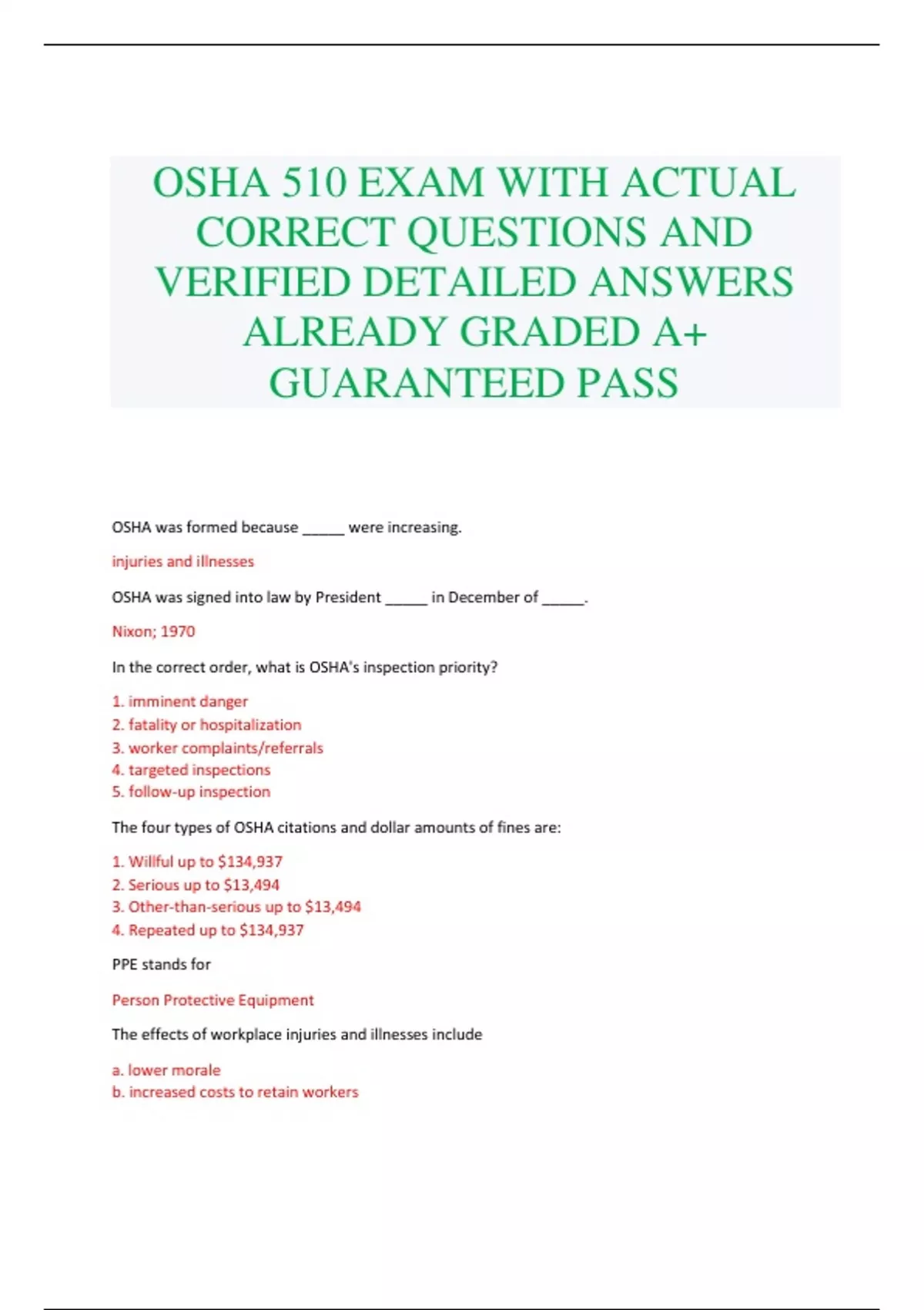 OSHA 510 EXAM WITH ACTUAL CORRECT QUESTIONS AND VERIFIED DETAILED ANSWERS ALREADY GRADED A+ GUARANTEED PASS