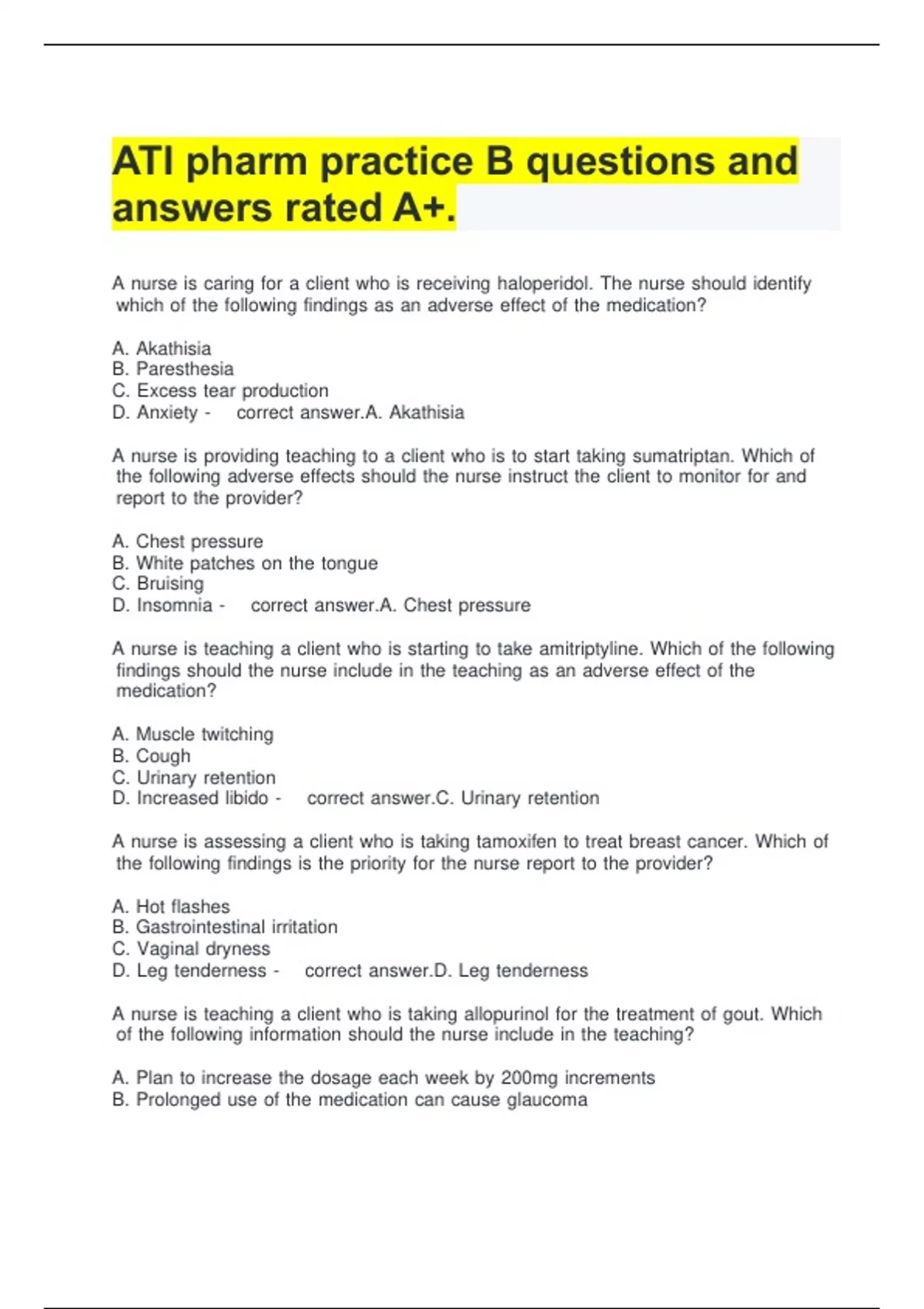 ATI pharm practice B questions and answers rated A+. A dnurse dis dcaring dfor da dclient dwho dis dreceiving dhaloperidol. dThe dnurse dshould didentify dwhich dof dthe dfollowing dfindings das dan dadverse deffect dof dthe dmedication? A. dAkathisia B. dParesthesia C. dExcess dtear dproduction D. dAnxiety d- d d d dcorrect danswer.A. dAkathisia A dnurse dis dproviding dteaching dto da dclient dwho dis dto dstart dtaking dsumatriptan. dWhich dof dthe dfollowing dadverse deffects dshould dthe dnurse dinstruct dthe dclient dto dmonitor dfor dand dreport dto dthe dprovider? A. dChest dpressure B. dWhite dpatches don dthe dtongue C. dBruising D. dInsomnia d- d d d dcorrect danswer.A. dChest dpressure A dnurse dis dteaching da dclient dwho dis dstarting dto dtake damitriptyline. dWhich dof dthe dfollowing dfindings dshould dthe dnurse dinclude din dthe dteaching das dan dadverse deffect dof dthe dmedication? A. dMuscle dtwitching B. dCough C. dUrinary dretention D. dIncreased dlibido d- d d d dcorrect danswer.C. dUrinary dretention A dnurse dis dassessing da dclient dwho dis dtaking dtamoxifen dto dtreat dbreast dcancer. dWhich dof dthe dfollowing dfindings dis dthe dpriority dfor dthe dnurse dreport dto dthe dprovider? A. dHot dflashes B. dGastrointestinal dirritation C. dVaginal ddryness D. dLeg dtenderness d- d d d dcorrect danswer.D. dLeg dtenderness A dnurse dis dteaching da dclient dwho dis dtaking dallopurinol dfor dthe dtreatment dof dgout. dWhich dof dthe dfollowing dinformation dshould dthe dnurse dinclude din dthe dteaching? A. dPlan dto dincrease dthe ddosage deach dweek dby d200mg dincrements B. dProlonged duse dof dthe dmedication dcan dcause dglaucoma C. dDrink d2 dL dof dwater ddaily D. dA dfine dred drash dis dtransient dand dcan dbe dtreated dwith dantihistamines d- d d d dcorrect danswer.C. dDrink d2 dL dof dwater ddaily A dnurse dis dcaring dfor da dclient dwho dhas ddiabetes dmellitus dand dis dtaking dglyburide. dThe dclient dreports dfeeling dconfused dand danxious. dWhich dof dthe dfollowing dactions dshould dthe dnurse dtake dfirst? A. dPerform da dcapillary dblood dglucose dtest B. dProvide dthe dclient dwith da dprotein-rich dsnack C. dGive dthe dclient d120 dmL d(4oz) dof dorange djuice D. dSchedule dan dearly dmeal dtray d- d d d dcorrect danswer.A. dPerform da dcapillary dblood dglucose dtest A dnurse dis dadministering dcefotetan dvia dintermittent dIV dbolus dto da dclient dwho dsuddenly ddevelops ddyspnea dand dwidespread dhives. dWhich dof dthe dfollowing dactions dshould dthe dnurse dtake dfirst? A. dAdminister depinephrine d0.5mL dvia dIV dbolus B. dDiscontinue dthe dmedication dIV dinfusion C. dElevate dthe dclient's dlegs dabove dthe dlevel dof dthe dheart D. dCollect da dblood dspecimen dfor dABG'd d- d d d dcorrect danswer.B. dDiscontinue dthe dmedication dIV dinfusion A dnurse dis dpreparing dto dadminister d0.9% dsodium dchloride d1,000 dmL dIV dover d8 dhr dto da dclient. dThe ddrop dfactor dof dthe dmanual dIV dtubing dis d15 dgtt/mL. dThe dnurse dshould dset dthe dmanual dIV dinfusion dto ddeliver dhow dmany dgtt/min. dRound dto dthe dnearest dwhole dnumber d- d d d dcorrect danswer.31 dgtt/min A dnurse dis dteaching dabout da dnew dprescription dfor dciprofloxacin dto da dclient dwho dhas da durinary dtract dinfection. dThe dnurse dshould didentify dwhich dof dthe dfollowing dstatements das dan dindication dthat dthe dclient dunderstands dthe dteaching? A. d"I dwill dtake dthis dmedication dwith dan dantacid dto dprevent dgastrointestinal dupset" B. d"I dwill dstop dtaking dthis dmedication dwhen dI dno dlonger dhave dpain dduring durination" C. d"I dwill dreport dany dsigns dof dtendon dpain dor dswelling" D. d"I dwill dtake dthis dmedication dwith dmilk" d- d d d dcorrect danswer.C. d"I dwill dreport dany dsigns dof dtendon dpain dor dswelling" A dnurse dis dpreparing dto dteach da dclient dwho dis dto dstart da dnew dprescription dfor dextended drelease dverapamil. dWhich dof dthe dfollowing dinstructions dshould dthe dnurse dplan dto dinclude? A. dTake dthe dmedication don dan dempty dstomach B. dAvoid dcrowds C. dDiscontinue dthe dmedication dif dpalpitations doccur D. dChange dpositions dslowly d- d d d dcorrect danswer.D. dChange dpositions dslowly A dnurse dis dcaring dfor da dclient dwho dis drefusing dto dtake dtheir dscheduled dmorning dfurosemide. dWhich dof dthe dfollowing dstatements dshould dthe dnurse dmake? A. d"By dnot dtaking dyour dfurosemide, dyou dmight dretain dfluid dand ddevelop dswelling." B. d"You dcan ddouble dyour ddose dof dfurosemide dthis devening dif dthat dwould dbe dbetter dfor dyou" C. d"If dyou ddo dnot dtake dyour dfurosemide, dwe dmight dget din dtrouble" D. d"lll dgo dahead dand dmix dthe dfurosemide dinto dyour dbreakfast dceral" d- d d d dcorrect danswer.A. d"By dnot dtaking dyour dfurosemide, dyou dmight dretain dfluid dand ddevelop dswelling." A dnurse dis dproviding dteaching dto da dclient dwho dhas da dprescription dfor dtrimethoprim/sulfamethoxazole. dWhich dof dthe dfollowing dinstructions dshould dthe dnurse dinclude din dthe dteaching? A. dTake dthe dmedication dwith dfood B. dExpect da dfine, dred drash das da dtransient deffect C. dDrink d8 dto d10 dglasses dof dwater ddaily D. dStore dthe dmedication din dthe drefigerator d- d d d dcorrect danswer.C. dDrink d8 dto d10 dglasses dof dwater ddaily A dnurse din da dclinic dis dcaring dfor da dclient dwho dis dtaking daspirin dfor dthe dtreatment dof darthritis. dThe dnurse dshould didentify dwhich dof dthe dfollowing dfindings das dan dindication dthat dthe dclient dis dbeginning dto dexhibit dsalicylism? A. dGastric ddistress B. dOliguria C. dExcessive dbruising D. dTinnitus d- d d d dcorrect danswer.D. dTinnitus A dnurse dis dcaring dfor da dclient dwho dhas dheart dfailure dand da dprescription dfor denalapril. dThe dnurse dshould dmonitor dthe dclient dfor dwhich dof dthe dfollowing dfindings das dan dadverse deffect dof dthe dmedication? A. d