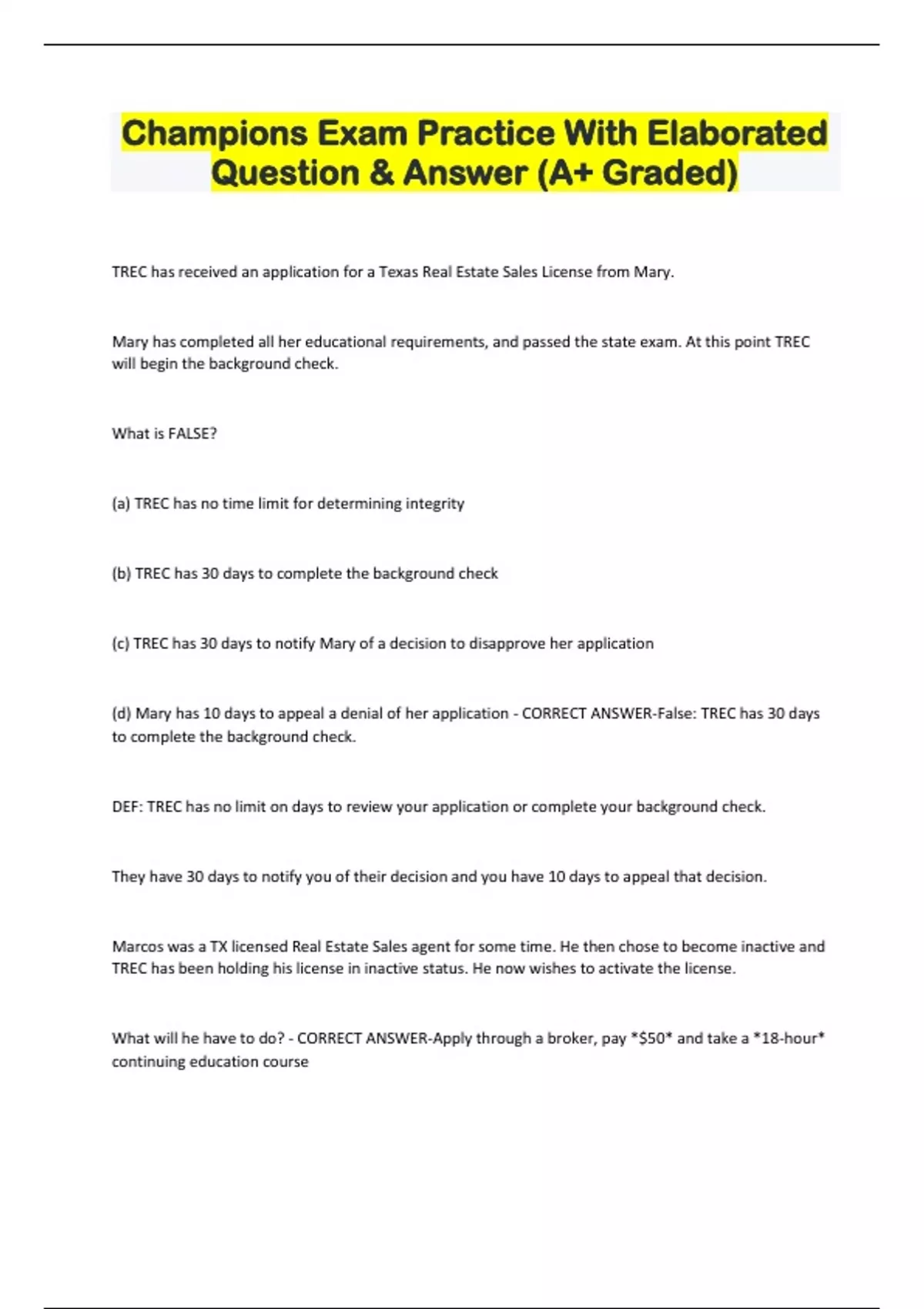 Champions Exam Practice With Elaborated Question & Answer (A+ Graded) TREC has received an application for a Texas Real Estate Sales License from Mary. Mary has completed all her educational requirements, and passed the state exam. At this point TREC will begin the background check. What is FALSE? (a) TREC has no time limit for determining integrity (b) TREC has 30 days to complete the background check (c) TREC has 30 days to notify Mary of a decision to disapprove her application (d) Mary has 10 days to appeal a denial of her application - CORRECT ANSWER-False: TREC has 30 days to complete the background check.