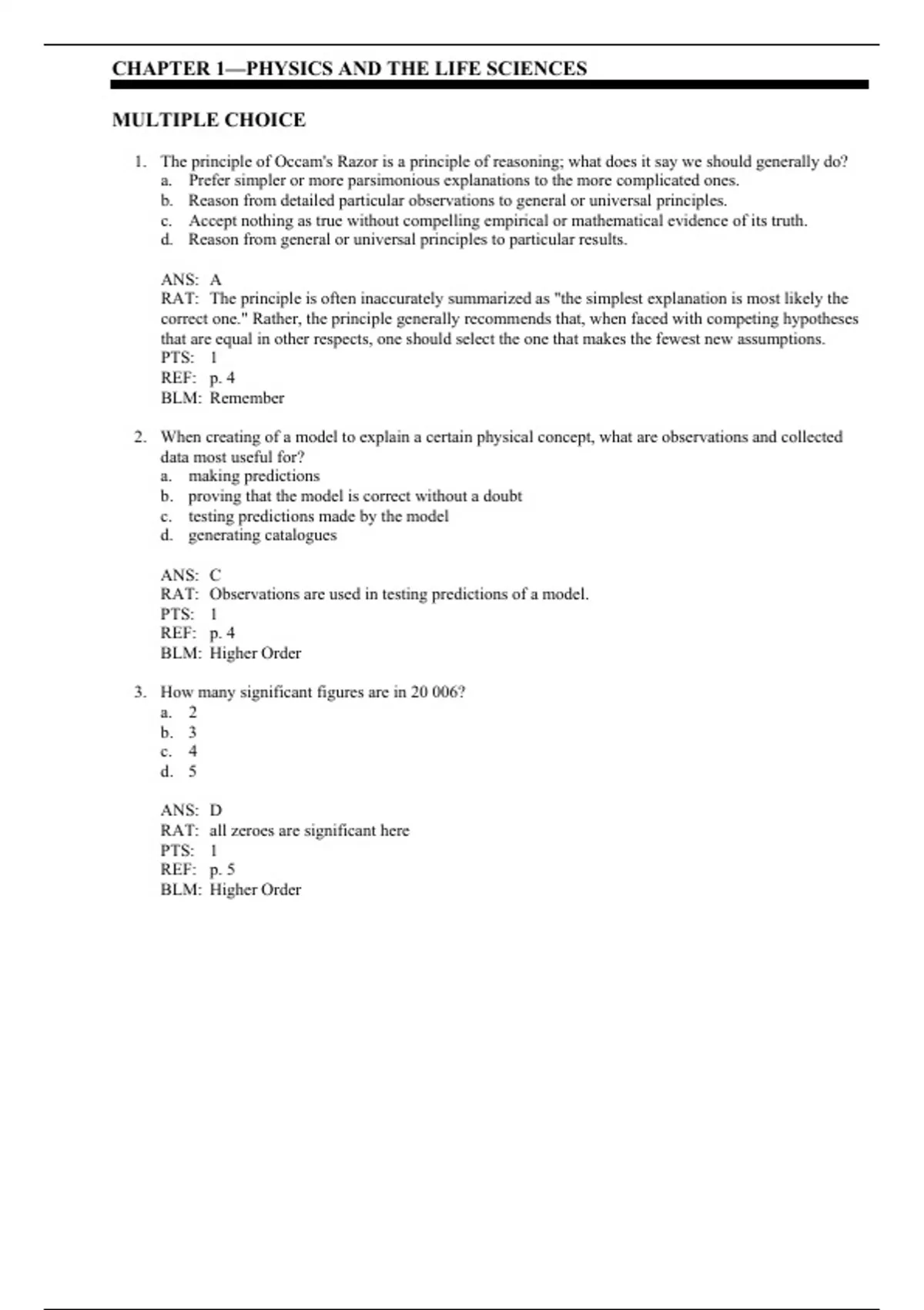 1. The principle of Occam's Razor is a principle of reasoning; what does it say we should generally do?
