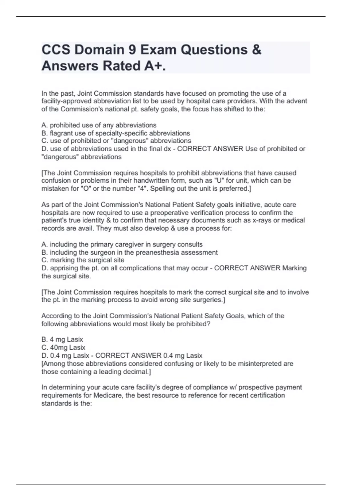 CCS Domain 9 Exam Questions & Answers Rated A+. In the past, Joint Commission standards have focused on promoting the use of a facility-approved abbreviation list to be used by hospital care providers. With the advent of the Commission's national pt. safety goals, the focus has shifted to the: A. prohibited use of any abbreviations B. flagrant use of specialty-specific abbreviations C. use of prohibited or "dangerous" abbreviations D. use of abbreviations used in the final dx - CORRECT ANSWER Use of prohibited or "dangerous" abbreviations [The Joint Commission requires hospitals to prohibit abbreviations that have caused confusion or problems in their handwritten form, such as "U" for unit, which can be mistaken for "O" or the number "4". Spelling out the unit is preferred.] As part of the Joint Commission's National Patient Safety goals initiative, acute care hospitals are now required to use a preoperative verification process to confirm the patient's true identity & to confirm that necessary documents such as x-rays or medical records are avail. They must also develop & use a process for: A. including the primary caregiver in surgery consults B. including the surgeon in the preanesthesia assessment C. marking the surgical site D. apprising the pt. on all complications that may occur - CORRECT ANSWER Marking the surgical site. [The Joint Commission requires hospitals to mark the correct surgical site and to involve the pt. in the marking process to avoid wrong site surgeries.] According to the Joint Commission's National Patient Safety Goals, which of the following abbreviations would most likely be prohibited? B. 4 mg Lasix C. 40mg Lasix D. 0.4 mg Lasix - CORRECT ANSWER 0.4 mg Lasix [Among those abbreviations considered confusing or likely to be misinterpreted are those containing a leading decimal.] In determining your acute care facility's degree of compliance w/ prospective payment requirements for Medicare, the best resource to reference for recent certification standards is the: A. CARF manual B. hospital bylaws C. Joint Commission accreditation manual D. Federal Register - CORRECT ANSWER Federal Register [CMS publishes both proposed & final rules for the Conditions of Participation for hospitals in the daily Federal Register] You have been asked to recommend time-limited documentation standards for inclusion in the Medical Staff Bylaws, Rules, and Regulations. The committee documentation standards must meet the standards of both the Joint Commission & the Medicare Conditions of Participation. The standards for the history and physical exam documentation are discussed first. You advise them that the time period for completion of this reports should be set at: A. 12 hrs after admission B. 24 hrs after admission C. 12 hrs after admission or prior to surgery D. 24 hrs after admission or prior to surgery - CORRECT ANSWER 24 hrs after admission or prior to surgery. [These meets both Joint Commission & COP standards.] Accreditation by Joint Commission is a voluntary activity for a facility & it is: A. considered unnecessary by most health care facilities B. required for state licensure in all states C. conducted in each facility annually D. required for reimbursement of certain payment groups - CORRECT ANSWER Required for reimbursement of certain payment groups. [A. Advantages of accreditation are numerous & include financial & legal incentives. B. State licensure is required for accreditation but not the reverse. C. Joint Commission conducts unannounced on-site surveys approx. every 3 years.] The best resource for checking out specific voluntary accreditation standards and guidelines for a rehabilitation facility is the: A. Conditions of Participation for Rehabilitation Facilities. B. Medical Staff Bylaws, Rules, and Regulations C. Joint Commission manual D. CARF manual - CORRECT ANSWER CARF manual [The manual published by the Commission of Accreditation for Rehabilitation Facilities will have the most specific & comprehensive standards for a rehabilitation facility.] Before making recommendations to the Executive Committee regarding new physicians who have applied for active membership, the Credentials Committee must query the: A. peer review organization B. National Practitioner Data Bank C. risk manager D. Health Plan Employer Data & Information Set - CORRECT ANSWER National Practitioner Data Bank [With the passage of the health Care Quality Improvement Act of 1986, the NPDB was established. Hospitals are required to query the data bank before granting clinical privileges to physicians.]