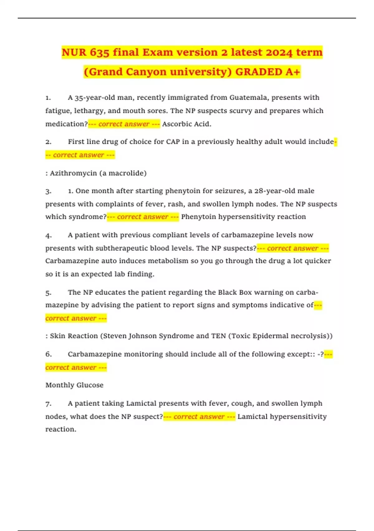 NUR 635 final Exam version 2 latest 2024 term (Grand Canyon university) GRADED A+ 1. A 35-year-old man, recently immigrated from Guatemala, presents with fatigue, lethargy, and mouth sores. The NP suspects scurvy and prepares which medication?--- correct answer --- Ascorbic Acid. 2. First line drug of choice for CAP in a previously healthy adult would include--- correct answer --- : Azithromycin (a macrolide) 3. 1. One month after starting phenytoin for seizures, a 28-year-old male presents with complaints of fever, rash, and swollen lymph nodes. The NP suspects which syndrome?--- correct answer --- Phenytoin hypersensitivity reaction 4. A patient with previous compliant levels of carbamazepine levels now presents with subtherapeutic blood levels. The NP suspects?--- correct answer --- Carbamazepine auto induces metabolism so you go through the drug a lot quicker so it is an expected lab finding.