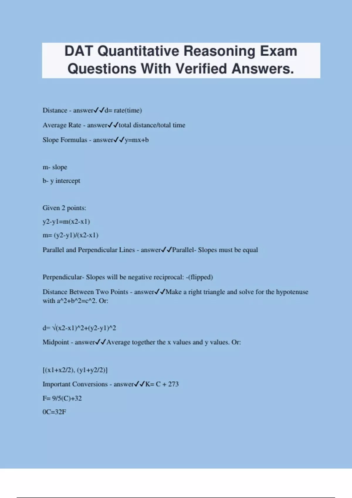 DAT Quantitative Reasoning Exam Questions With Verified Answers. Distance - answerd= rate(time) Average Rate - answertotal distance/total time Slope Formulas - answery=mx+b m- slope b- y intercept Given 2 points: y2-y1=m(x2-x1) m= (y2-y1)/(x2-x1) Parallel and Perpendicular Lines - answerParallel- Slopes must be equal Perpendicular- Slopes will be negative reciprocal: -(flipped) Distance Between Two Points - answerMake a right triangle and solve for the hypotenuse with a^2+b^2=c^2. Or: d= √(x2-x1)^2+(y2-y1)^2 Midpoint - answerAverage together the x values and y values. Or: [(x1+x2/2), (y1+y2/2)] Important Conversions - answerK= C + 273 F= 9/5(C)+32 0C=32F 1 in = 2.54 cm 1 mi = 5280 ft 1 ft = 12 in 1 yd = 3 ft 1 m = 1.1 yd 1 kg = 2.2 lbs 1 lb = 454 g = 16 oz Quadratic Equations - answerFor any equation in the format: ax^2 + bx + c = 0 (x+y)(x-y) = x²-y² (x+y)² = x² + 2xy + y² (x-y)² = x² - 2xy - y² Multiplying Exponents (with the same base) - answer(x^a)(x^b)= x^a+b Add the exponents. Dividing Exponents (with the same base) - answerx^a/x^b = x^a-b Subtract the exponents. Exponent to the power of another number - answer(x^a)^b = x^a*b Multiply the exponents. Multiplying Exponents (with different bases) - answer(x^b)(y^b)=(xy)^b Multiply those two bases and have them to the og exponent. Dividing Exponents (with different bases) - answer(x^b/y^b) = (x/y)^b