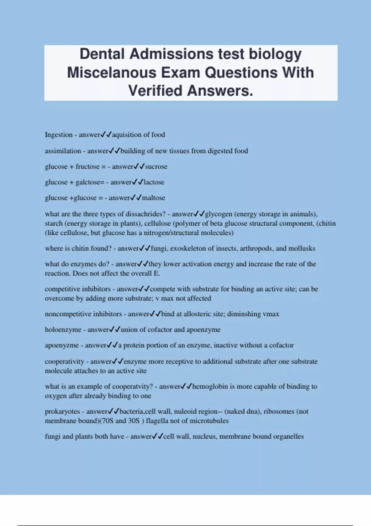 Dental Admissions test biology Miscelanous Exam Questions With Verified Answers. Ingestion - answeraquisition of food assimilation - answerbuilding of new tissues from digested food glucose + fructose = - answersucrose glucose + galctose= - answerlactose glucose +glucose = - answermaltose what are the three types of dissachrides? - answerglycogen (energy storage in animals), starch (energy storage in plants), cellulose (polymer of beta glucose structural component, (chitin (like cellulose, but glucose has a nitrogen/structural molecules) where is chitin found? - answerfungi, exoskeleton of insects, arthropods, and mollusks what do enzymes do? - answerthey lower activation energy and increase the rate of the reaction. Does not affect the overall E. competitive inhibitors - answercompete with substrate for binding an active site; can be overcome by adding more substrate; v max not affected noncompetitive inhibitors - answerbind at allosteric site; diminshing vmax holoenzyme - answerunion of cofactor and apoenzyme apoenyzme - answera protein portion of an enzyme, inactive without a cofactor cooperativity - answerenzyme more receptive to additional substrate after one substrate molecule attaches to an active site what is an example of cooperatvity? - answerhemoglobin is more capable of binding to oxygen after already binding to one prokaryotes - answerbacteria,cell wall, nuleoid region-- (naked dna), ribosomes (not membrane bound)(70S and 30S ) flagella not of microtubules fungi and plants both have - answercell wall, nucleus, membrane bound organelles