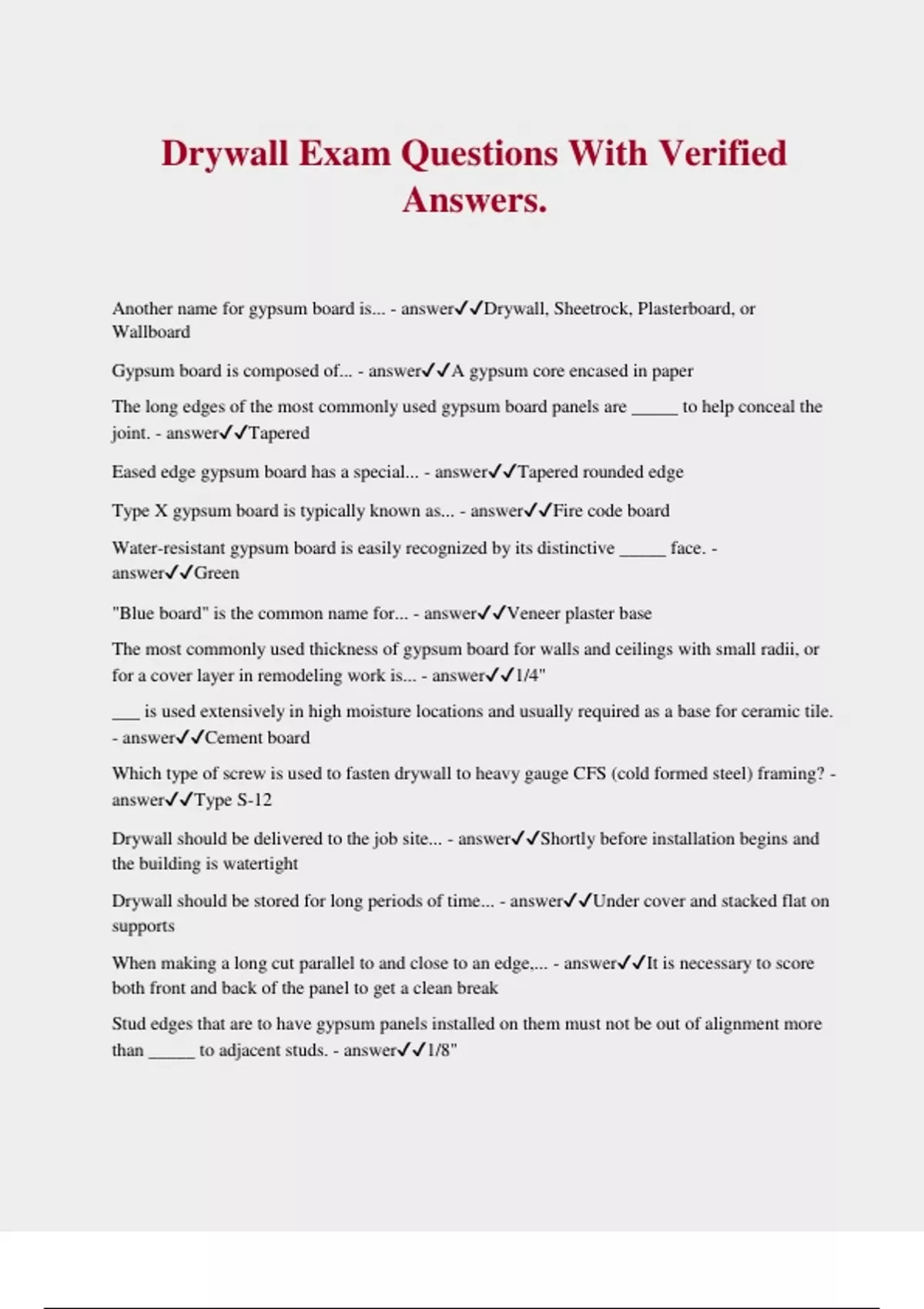 Drywall Exam Questions With Verified Answers. Another name for gypsum board is... - answerDrywall, Sheetrock, Plasterboard, or Wallboard Gypsum board is composed of... - answerA gypsum core encased in paper The long edges of the most commonly used gypsum board panels are _____ to help conceal the joint. - answerTapered Eased edge gypsum board has a special... - answerTapered rounded edge Type X gypsum board is typically known as... - answerFire code board Water-resistant gypsum board is easily recognized by its distinctive _____ face. - answerGreen "Blue board" is the common name for... - answerVeneer plaster base The most commonly used thickness of gypsum board for walls and ceilings with small radii, or for a cover layer in remodeling work is... - answer1/4" ___ is used extensively in high moisture locations and usually required as a base for ceramic tile. - answerCement board Which type of screw is used to fasten drywall to heavy gauge CFS (cold formed steel) framing? - answerType S-12 Drywall should be delivered to the job site... - answerShortly before installation begins and the building is watertight Drywall should be stored for long periods of time... - answerUnder cover and stacked flat on supports When making a long cut parallel to and close to an edge,... - answerIt is necessary to score both front and back of the panel to get a clean break Stud edges that are to have gypsum panels installed on them must not be out of alignment more than _____ to adjacent studs. - answer1/8"