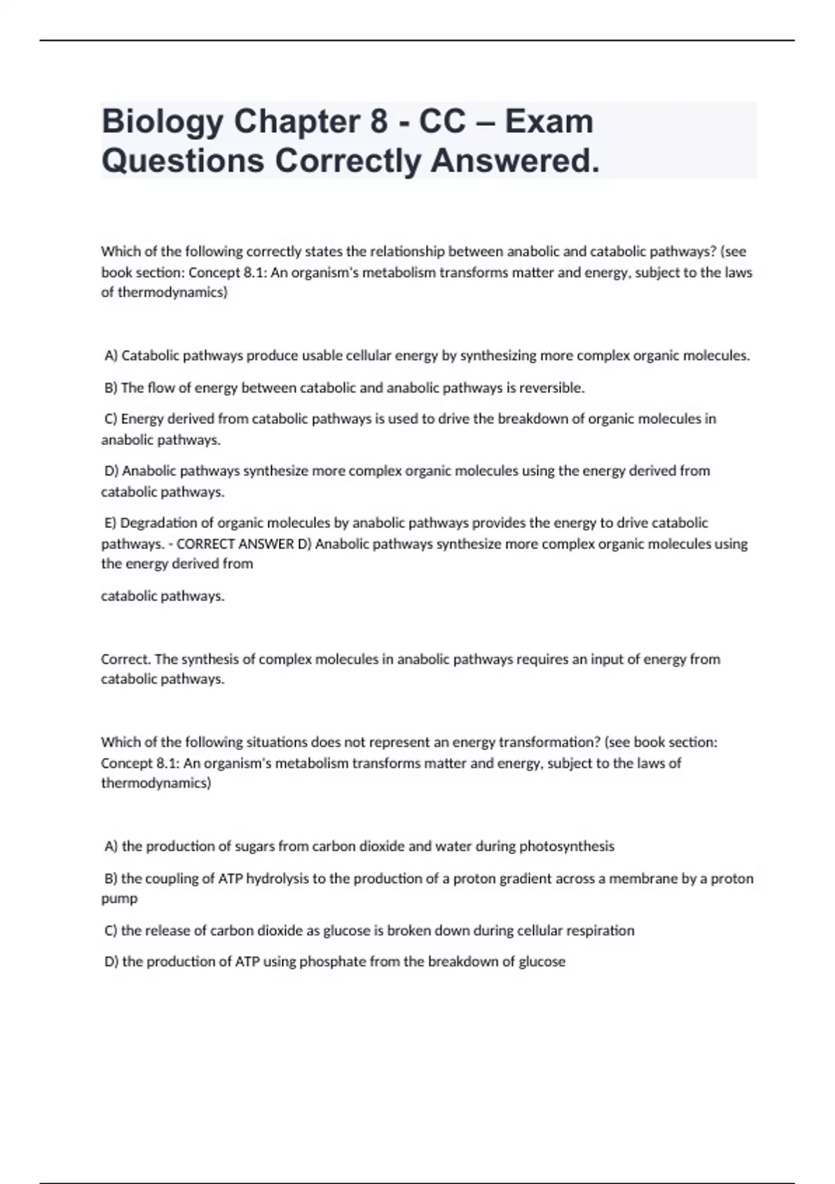 Biology Chapter 8 - CC – Exam Questions Correctly Answered. Which of the following correctly states the relationship between anabolic and catabolic pathways? (see book section: Concept 8.1: An organism's metabolism transforms matter and energy, subject to the laws of thermodynamics) A) Catabolic pathways produce usable cellular energy by synthesizing more complex organic molecules. B) The flow of energy between catabolic and anabolic pathways is reversible. C) Energy derived from catabolic pathways is used to drive the breakdown of organic molecules in anabolic pathways. D) Anabolic pathways synthesize more complex organic molecules using the energy derived from catabolic pathways. E) Degradation of organic molecules by anabolic pathways provides the energy to drive catabolic pathways. - CORRECT ANSWER D) Anabolic pathways synthesize more complex organic molecules using the energy derived from catabolic pathways. Correct. The synthesis of complex molecules in anabolic pathways requires an input of energy from catabolic pathways. Which of the following situations does not represent an energy transformation? (see book section: Concept 8.1: An organism's metabolism transforms matter and energy, subject to the laws of thermodynamics) A) the production of sugars from carbon dioxide and water during photosynthesis B) the coupling of ATP hydrolysis to the production of a proton gradient across a membrane by a proton pump C) the release of carbon dioxide as glucose is broken down during cellular respiration D) the production of ATP using phosphate from the breakdown of glucose E) All of the listed responses represent energy transformations. - CORRECT ANSWER B) the coupling of ATP hydrolysis to the production of a proton gradient across a membrane by a proton pump Correct. The energy stored in ATP is used to create an electrochemical gradient of protons that contains energy. Organisms are described as thermodynamically open systems. Which of the following statements is consistent with this description? (see book section: Concept 8.1: An organism's metabolism transforms matter and energy, subject to the laws of thermodynamics) A) Because energy must be conserved, organisms constantly recycle energy and thus need no input of energy. B) Heat produced by the organism is conserved in the organism and not lost to the environment. C) The metabolism of an organism is isolated from its surroundings. D) Organisms acquire energy from, and lose energy to, their surroundings. E) All of the listed responses are correct. - CORRECT ANSWER D) Organisms acquire energy from, and lose energy to, their surroundings. Correct. Open systems are those in which energy and materials can be exchanged between the system and its surroundings. Consider the growth of a farmer's crop over a season. Which of the following correctly states a limitation imposed by the first or second law of thermodynamics? (see book section: Concept 8.1: An organism's metabolism transforms matter and energy, subject to the laws of thermodynamics) A) To obey the first law, the crops must represent an open system. B) Growth of the crops must occur spontaneously. C) The process of photosynthesis produces energy that the plant uses to grow. D) The entropy of the universe must decrease to account for the increased entropy associated with plant growth. E) All of the listed responses are correct. - CORRECT ANSWER A) To obey the first law, the crops must represent an open system.