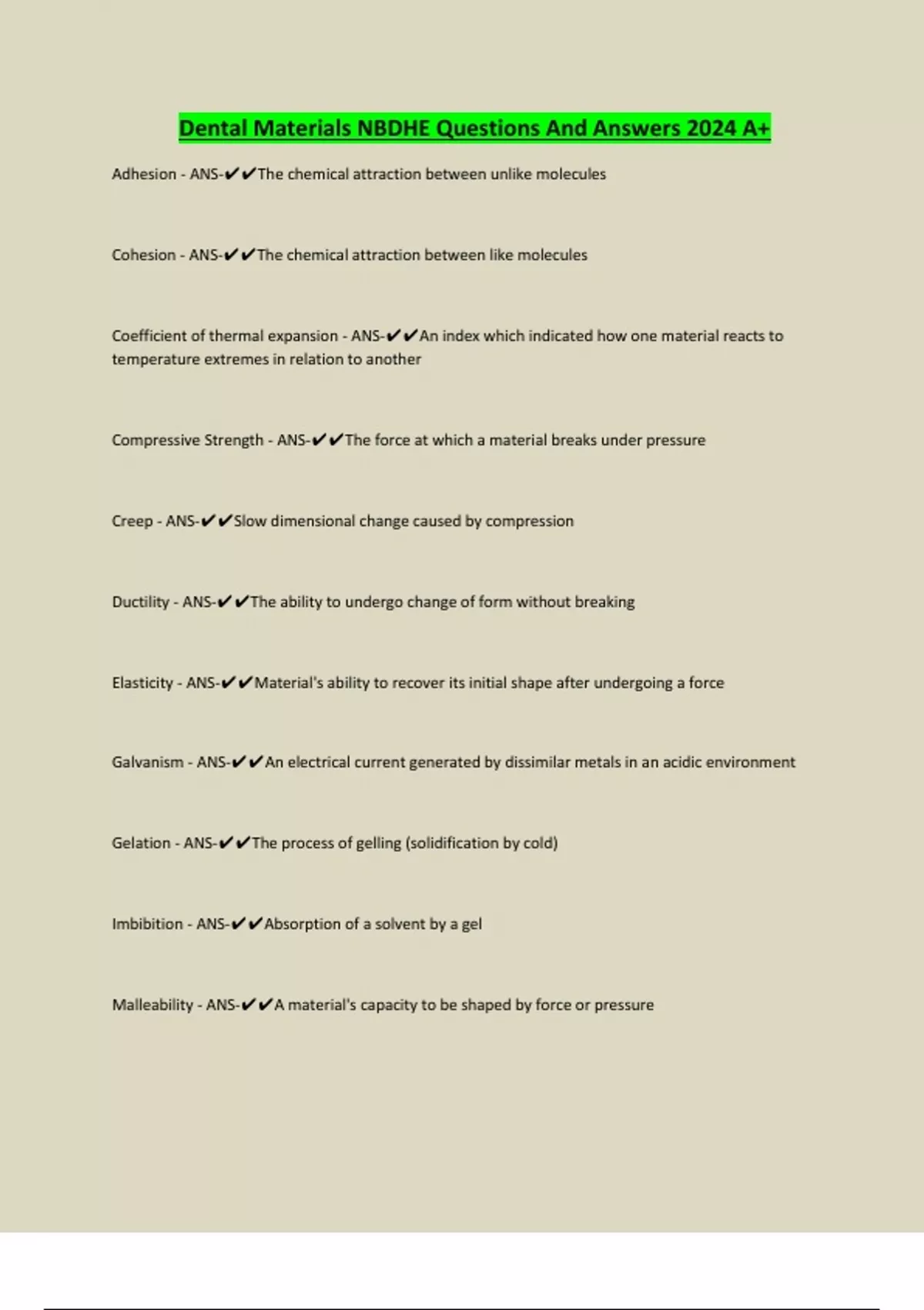 Dental Materials NBDHE Questions And Answers 2024 A+ Adhesion - ANS-The chemical attraction between unlike molecules Cohesion - ANS-The chemical attraction between like molecules Coefficient of thermal expansion - ANS-An index which indicated how one material reacts to temperature extremes in relation to another Compressive Strength - ANS-The force at which a material breaks under pressure Creep - ANS-Slow dimensional change caused by compression Ductility - ANS-The ability to undergo change of form without breaking Elasticity - ANS-