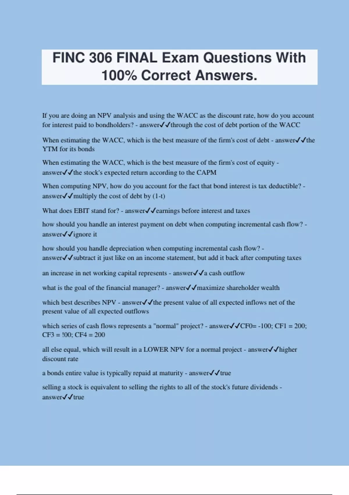 FINC 306 FINAL Exam Questions With 100% Correct Answers. If you are doing an NPV analysis and using the WACC as the discount rate, how do you account for interest paid to bondholders? - answerthrough the cost of debt portion of the WACC When estimating the WACC, which is the best measure of the firm's cost of debt - answerthe YTM for its bonds When estimating the WACC, which is the best measure of the firm's cost of equity - answerthe stock's expected return according to the CAPM When computing NPV, how do you account for the fact that bond interest is tax deductible? - answermultiply the cost of debt by (1-t) What does EBIT stand for? - answerearnings before interest and taxes how should you handle an interest payment on debt when computing incremental cash flow? - answerignore it how should you handle depreciation when computing incremental cash flow? - answersubtract it just like on an income statement, but add it back after computing taxes an increase in net working capital represents - answera cash outflow what is the goal of the financial manager? - answermaximize shareholder wealth which best describes NPV - answerthe present value of all expected inflows net of the present value of all expected outflows which series of cash flows represents a "normal" project? - answerCF0= -100; CF1 = 200; CF3 = !00; CF4 = 200 all else equal, which will result in a LOWER NPV for a normal project - answerhigher discount rate a bonds entire value is typically repaid at maturity - answertrue selling a stock is equivalent to selling the rights to all of the stock's future dividends - answertrue