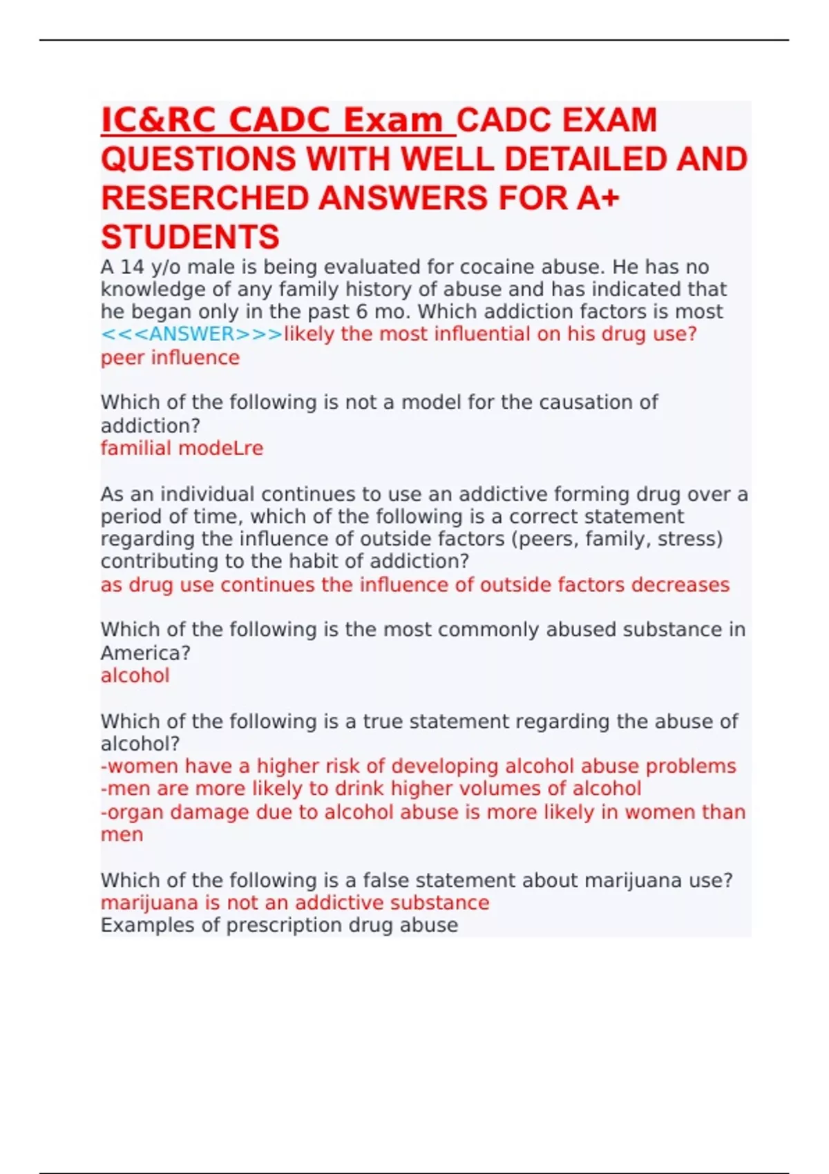 IC&RC CADC Exam CADC EXAM QUESTIONS WITH WELL DETAILED AND RESERCHED ANSWERS FOR A+ STUDENTS