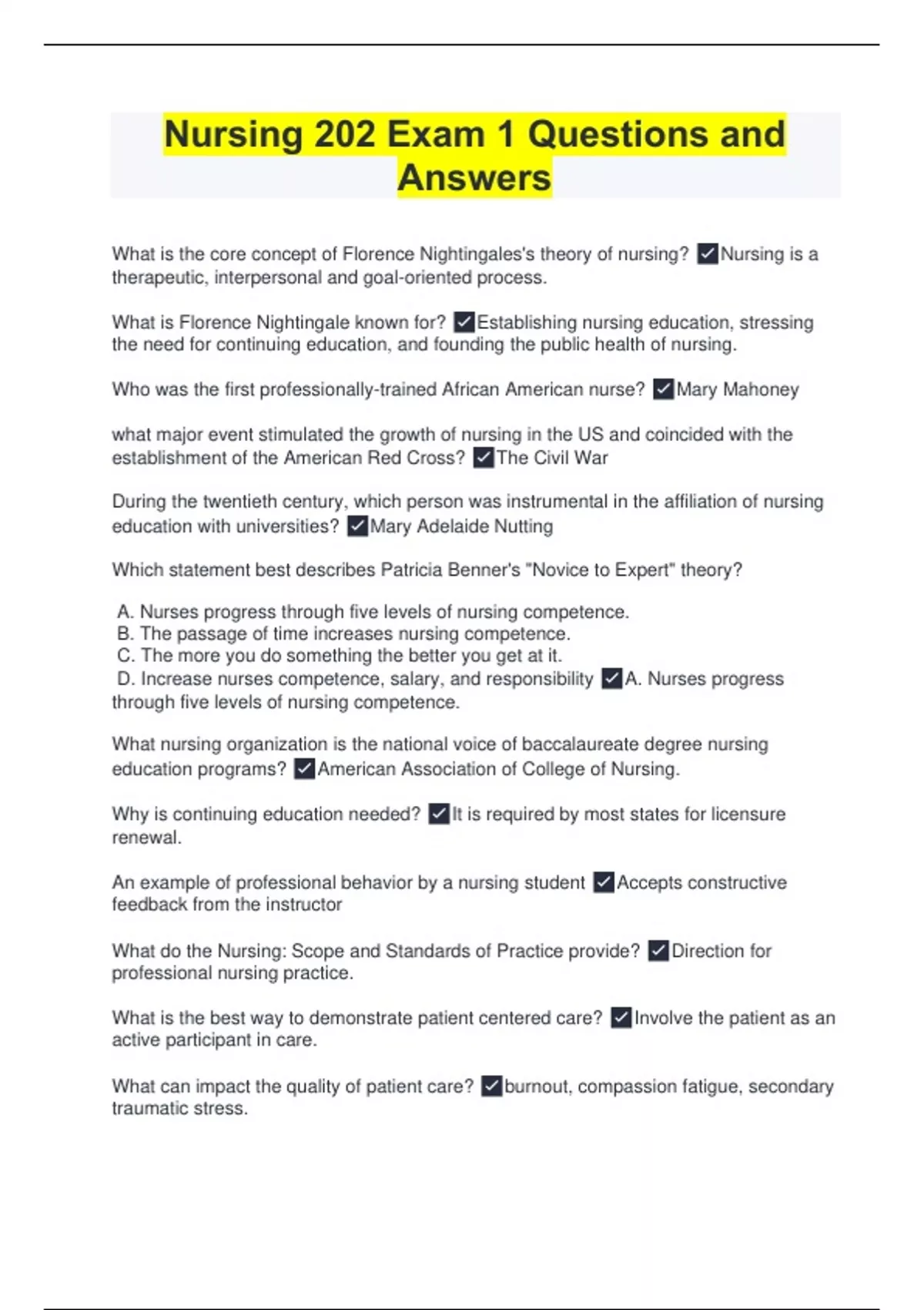 What is the core concept of Florence Nightingales's theory of nursing? Nursing is a therapeutic, interpersonal and goal-oriented process. What is Florence Nightingale known for? Establishing nursing education, stressing the need for continuing education, and founding the public health of nursing. Who was the first professionally-trained African American nurse? Mary Mahoney what major event stimulated the growth of nursing in the US and coincided with the establishment of the American Red Cross? The Civil War During the twentieth century, which person was instrumental in the affiliation of nursing education with universities? Mary Adelaide Nutting Which statement best describes Patricia Benner's "Novice to Expert" theory? A. Nurses progress through five levels of nursing competence. B. The passage of time increases nursing competence. C. The more you do something the better you get at it. D. Increase nurses competence, salary, and responsibility A. Nurses progress through five levels of nursing competence. What nursing organization is the national voice of baccalaureate degree nursing education programs? American Association of College of Nursing. Why is continuing education needed? It is required by most states for licensure renewal. An example of professional behavior by a nursing student Accepts constructive feedback from the instructor What do the Nursing: Scope and Standards of Practice provide? Direction for professional nursing practice. What is the best way to demonstrate patient centered care? Involve the patient as an active participant in care. What can impact the quality of patient care? burnout, compassion fatigue, secondary traumatic stress.