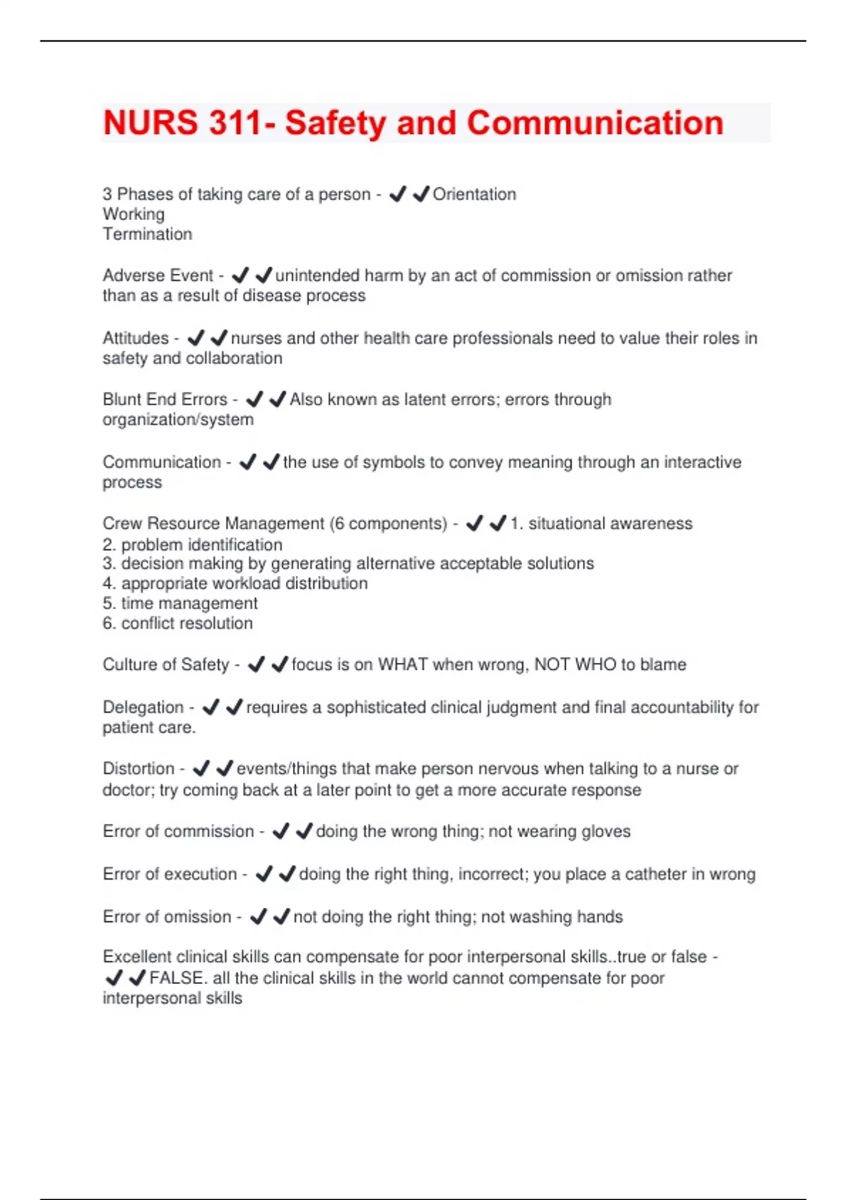 3 Phases of taking care of a person - ️️Orientation Working Termination Adverse Event - ️️unintended harm by an act of commission or omission rather than as a result of disease process Attitudes - ️️nurses and other health care professionals need to value their roles in safety and collaboration Blunt End Errors - ️️Also known as latent errors; errors through organization/system Communication - ️️the use of symbols to convey meaning through an interactive process Crew Resource Management (6 components) - ️️1. situational awareness 2. problem identification 3. decision making by generating alternative acceptable solutions 4. appropriate workload distribution 5. time management 6. conflict resolution Culture of Safety - ️️focus is on WHAT when wrong, NOT WHO to blame Delegation - ️️requires a sophisticated clinical judgment and final accountability for patient care. Distortion - ️️events/things that make person nervous when talking to a nurse or doctor; try coming back at a later point to get a more accurate response Error of commission - ️️doing the wrong thing; not wearing gloves Error of execution - ️️doing the right thing, incorrect; you place a catheter in wrong Error of omission - ️️not doing the right thing; not washing hands Excellent clinical skills can compensate for poor interpersonal skills..true or false - ️️FALSE. all the clinical skills in the world cannot compensate for poor interpersonal skillsHow does the Lewis Blackman story exemplify a never event? - ️️He starts to code but no one notices (blood pressure is key) If a patient was just told her pregnancy test was positive and she states that she is having difficulty breathing and feels like her heart is pounding out of her chest. What should you do. - ️️Stay with the patient and provide support. Don't leave alone, eat or increase stimulation by walking around. Just Culture - ️️seeks to find a balance between the need to learn from mistakes and the need for disciplinary action against employees Knowledge - ️️focus of safety is on the execution of skills, as well as on technology and systems level Linguistics - ️️the verbal exchange of messages through spoken words and written symbols; language barriers can occur Metacommunication - ️️affect how messages are received and interpreted would include internal personal states, environmental stimuli, contextual variables Most people have the innate capacity to recognize their own emotional needs, biases, and blind spots, as well as the impact of these on others. True or False - ️️False. As Burns knew, few people have the innate capacity to recognize their own emotional needs, biases, and blind spots as well as the impact of these on others. Near Miss - ️️error of commission or omission that could have harmed a patient, but harm did not occur as a result of chance Nontherapeutic Responses - ️️don't give false reassurance, agree with the patient's ideas right or wrong, give advice, probe, share stories about your pain Nonverbal Communication - ️️communicating through body language; patients will assume you are a good/bad nurse based on your body language when they first meet you Nurse Characteristics - ️️Professional, avoid personal attachments; authentic, be true to yourself; non-judgmental, accepting of other cultural belief systems/values Orientation - ️️identify role, introductions. Identify patient needs Paralinguistics - ️️the nonverbal exchange of symbols; less recognizable but important in the means of transmitting messages such as use of gesturesPatient Advisory Group - ️️a panel of safety experts including nurses, physicians, pharmacist, risk managers, engineers and others with experience addressing patient safety issues advises The Joint Commission on developing and updating the National Patient Safety Goals Right circumstance - ️️appropriate setting, available resources need to be considered Right directions - ️️provide a clear, concise description of the task including objective, limits, and expectations
