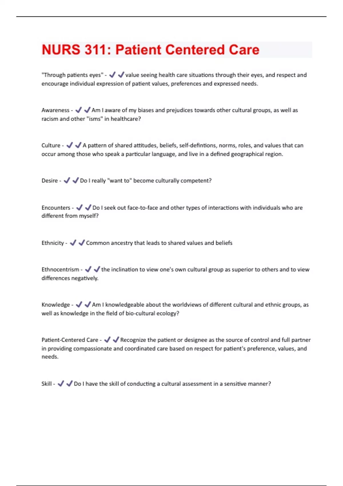 "Through patients eyes" - value seeing health care situations through their eyes, and respect and encourage individual expression of patient values, preferences and expressed needs. Awareness - Am I aware of my biases and prejudices towards other cultural groups, as well as racism and other "isms" in healthcare? Culture - A pattern of shared attitudes, beliefs, self-defintions, norms, roles, and values that can occur among those who speak a particular language, and live in a defined geographical region. Desire - Do I really "want to" become culturally competent? Encounters - Do I seek out face-to-face and other types of interactions with individuals who are different from myself? Ethnicity - Common ancestry that leads to shared values and beliefs Ethnocentrism - the inclination to view one's own cultural group as superior to others and to view differences negatively. Knowledge - Am I knowledgeable about the worldviews of different cultural and ethnic groups, as well as knowledge in the field of bio-cultural ecology? Patient-Centered Care - Recognize the patient or designee as the source of control and full partner in providing compassionate and coordinated care based on respect for patient's preference, values, and needs. Skill - Do I have the skill of conducting a cultural assessment in a sensitive manner?