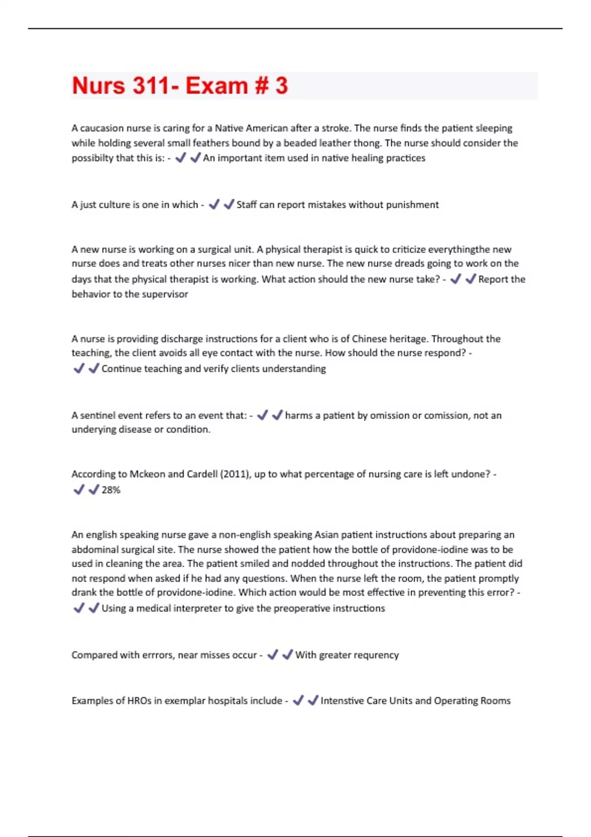 A caucasion nurse is caring for a Native American after a stroke. The nurse finds the patient sleeping while holding several small feathers bound by a beaded leather thong. The nurse should consider the possibilty that this is: - An important item used in native healing practices A just culture is one in which - Staff can report mistakes without punishment A new nurse is working on a surgical unit. A physical therapist is quick to criticize everythingthe new nurse does and treats other nurses nicer than new nurse. The new nurse dreads going to work on the days that the physical therapist is working. What action should the new nurse take? - Report the behavior to the supervisor A nurse is providing discharge instructions for a client who is of Chinese heritage. Throughout the teaching, the client avoids all eye contact with the nurse. How should the nurse respond? - Continue teaching and verify clients understanding A sentinel event refers to an event that: - harms a patient by omission or comission, not an underying disease or condition. According to Mckeon and Cardell (2011), up to what percentage of nursing care is left undone? - 28% An english speaking nurse gave a non-english speaking Asian patient instructions about preparing an abdominal surgical site. The nurse showed the patient how the bottle of providone-iodine was to be used in cleaning the area. The patient smiled and nodded throughout the instructions. The patient did not respond when asked if he had any questions. When the nurse left the room, the patient promptly drank the bottle of providone-iodine. Which action would be most effective in preventing this error? - Using a medical interpreter to give the preoperative instructions Compared with errrors, near misses occur - With greater requrency Examples of HROs in exemplar hospitals include - Intenstive Care Units and Operating RoomsHROs use root cause analysis (RCA) to: - Analyze instiutional problems Mckenon and Cardell (2011) describe the ultimate goal of root cause anaysis is to: - Prevent future harm Research had demonstrated that staffing with a higher percentage of RN's results in - Fewer adverser patient events The most prevalent HAC is - Urinary tract Infections The nurse is admitting an American client to a Mexican hospital in a small town. The client was raised in a country where medical care is easy to obtain. The nurse notices the patient is feeling embarrassed and anxious and is becoming frustrated. The nurse knows the patient is showing signs of which of the following? - Culture Shock The nurse is caring for a 12 year old child following an appendectomy (removal of appendix). What interventions could interfere with the quality and safety of nursing care? - Following the doctor's orders no matter what. The nurse is caring for a client who has recently immigrated from India. Which action by the nurse is appropriate when developing the nursing care plan? - Perform a cultural assessment The nurse is caring for a frail elderly client who immigrated to the United States from China in 1935. The client is able to speak English but has lived in a Chinese neighborhood with extended family since arriving to the U.S. Which factor should influence the nurse when planning care for this client? - Health care practices, rituals, religious beliefs, and food patterns need to be identified. The nurse is caring for a patient that does not speak English. When is it imperative that the nurse have an interpreter present for this patient? - When consent for treatment is needed