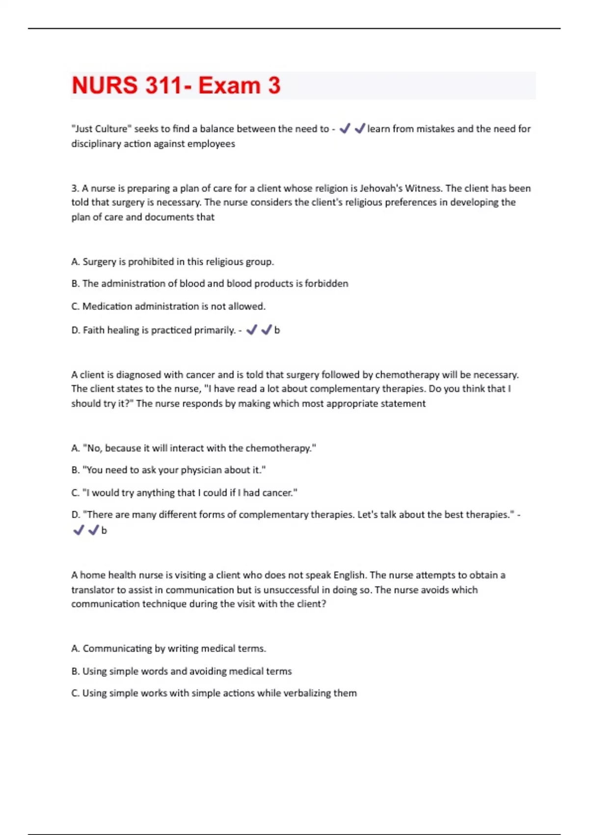 "Just Culture" seeks to find a balance between the need to - learn from mistakes and the need for disciplinary action against employees 3. A nurse is preparing a plan of care for a client whose religion is Jehovah's Witness. The client has been told that surgery is necessary. The nurse considers the client's religious preferences in developing the plan of care and documents that A. Surgery is prohibited in this religious group. B. The administration of blood and blood products is forbidden C. Medication administration is not allowed. D. Faith healing is practiced primarily. - b A client is diagnosed with cancer and is told that surgery followed by chemotherapy will be necessary. The client states to the nurse, "I have read a lot about complementary therapies. Do you think that I should try it?" The nurse responds by making which most appropriate statement A. "No, because it will interact with the chemotherapy." B. "You need to ask your physician about it." C. "I would try anything that I could if I had cancer." D. "There are many different forms of complementary therapies. Let's talk about the best therapies." - b A home health nurse is visiting a client who does not speak English. The nurse attempts to obtain a translator to assist in communication but is unsuccessful in doing so. The nurse avoids which communication technique during the visit with the client? A. Communicating by writing medical terms. B. Using simple words and avoiding medical terms C. Using simple works with simple actions while verbalizing themD. Discussing one topic at a time. - a A nurse educator is describing the yin and yang theory of the ancient Chinese philosophy of Tao to a group of nursing students. The nurse educator explains that foods are classified as hot and cold in this theory and are transformed into yin and yang energy when metabolized by the body. The nurse educator informs the students that a client who practices this belief A. Consumes cold foods when a "hot" illness is present B. Consumes hot foods when a "hot" illness is present C. Believes that yin foods are hot D. Believes that yang foods are cold - a