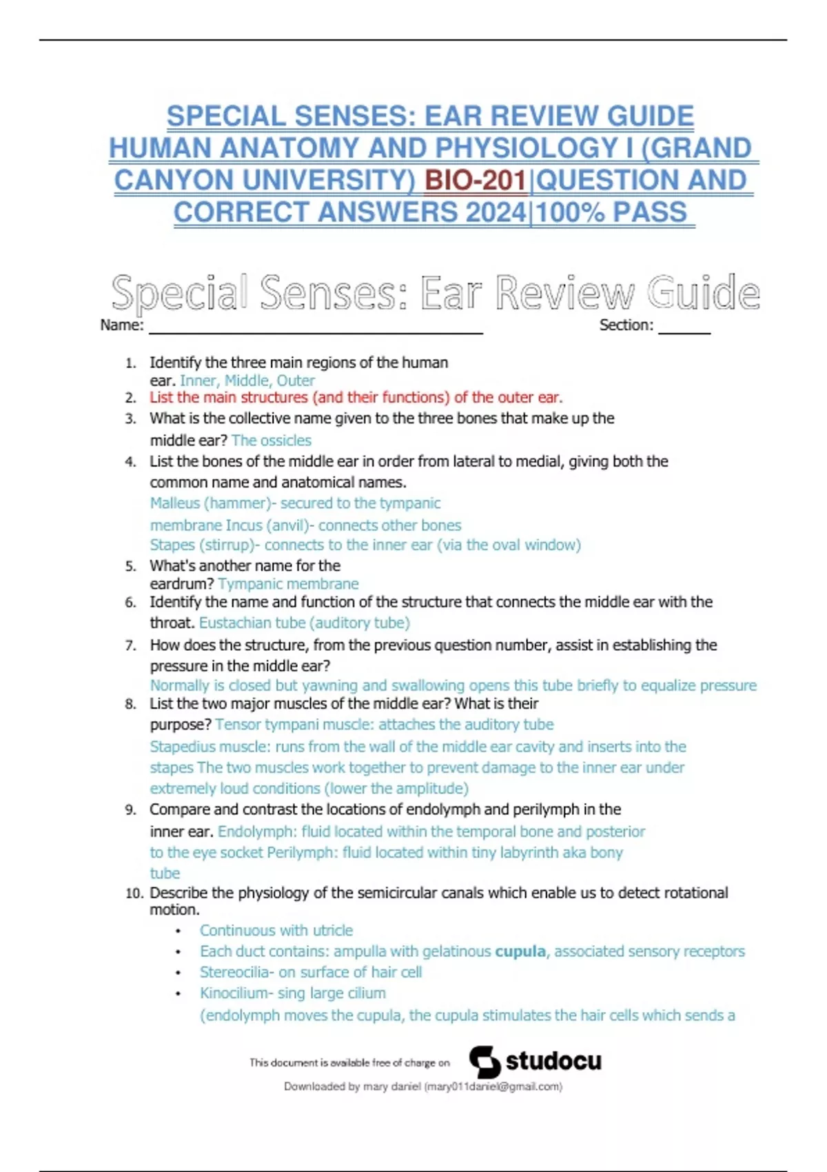 SPECIAL SENSES: EAR REVIEW GUIDE HUMAN ANATOMY AND PHYSIOLOGY I (GRAND CANYON UNIVERSITY) BIO-201|QUESTION AND CORRECT ANSWERS 2024|100% PASS