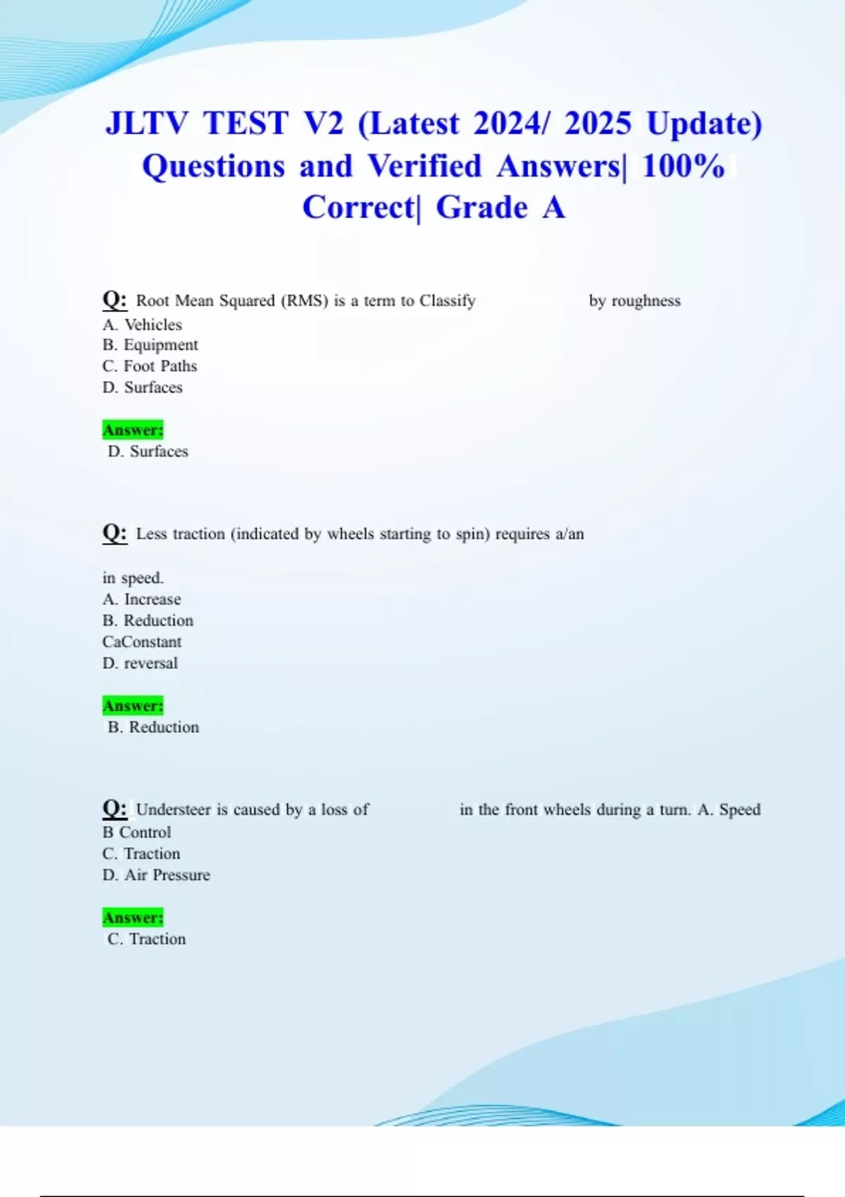 JLTV TEST V2 (Latest 2024/ 2025 Update) Questions and Verified Answers| 100% Correct| Grade A Q: Root Mean Squared (RMS) is a term to Classify by roughness A. Vehicles B. Equipment C. Foot Paths D. Surfaces Answer: D. Surfaces Q: Less traction (indicated by wheels starting to spin) requires a/an in speed. A. Increase B. Reduction C. Constant D. reversal Answer: B. Reduction Q: Understeer is caused by a loss of in the front wheels during a turn. A. Speed B Control C. Traction D. Air Pressure Answer: C. Traction Q: When performing a quick stop, explain what you should do if the JLTV skids or fishtails? Answer: Turn the steering wheel slightly into the direction of the skid (toward the rear end). Do not over react by either jerking the steering wheel or turning the steering wheel too much. Q: A effectively doubles the rated capacity of the winch. A. Chain B. Shackle C. Damper D. Snatch Block Answer: D. Snatch Block Q: Your JLTV is mired up to fender depth. Your JLT is equipped with a com- plete winch kit. Using the snatch block and an anchor, can you successfully perform a self-recovery on your JLTV? A. Yes B. No Answer: B. No Q: Which of the following conditions constitutes a Mire level 3? A. A JLTV mired up to the center of the wheels B. A JLTV mired with the top of the wheels at ground level C. A JLTV mired at the top of the fender D. A JLTV mired to the level of the hood Answer: D. A JLTV mired to the level of the hood