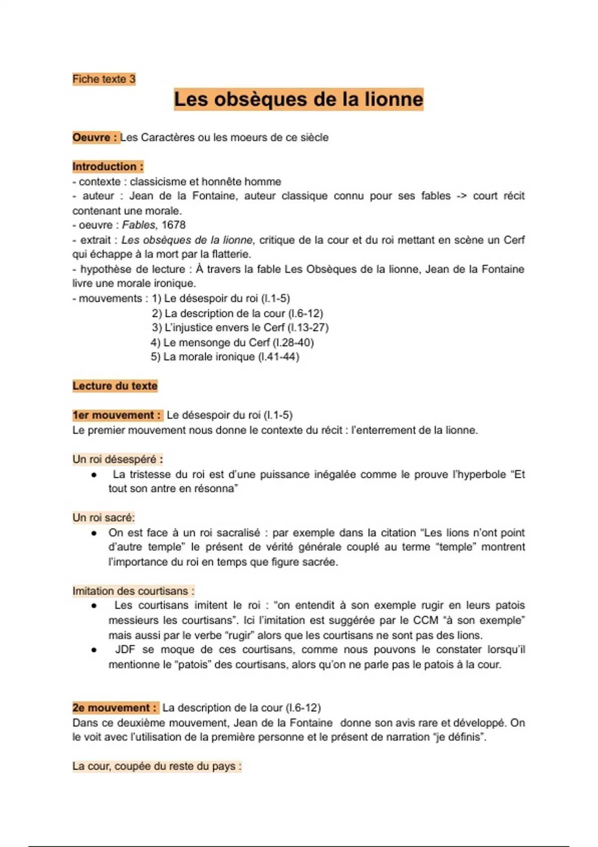 - hypothèse de lecture : À travers la fable Les Obsèques de la lionne, Jean de la Fontaine