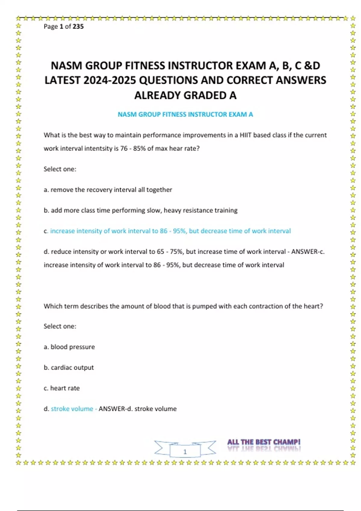 NASM GROUP FITNESS INSTRUCTOR EXAM A, B, C &D LATEST QUESTIONS AND CORRECT ANSWERS ALREADY GRADED A.