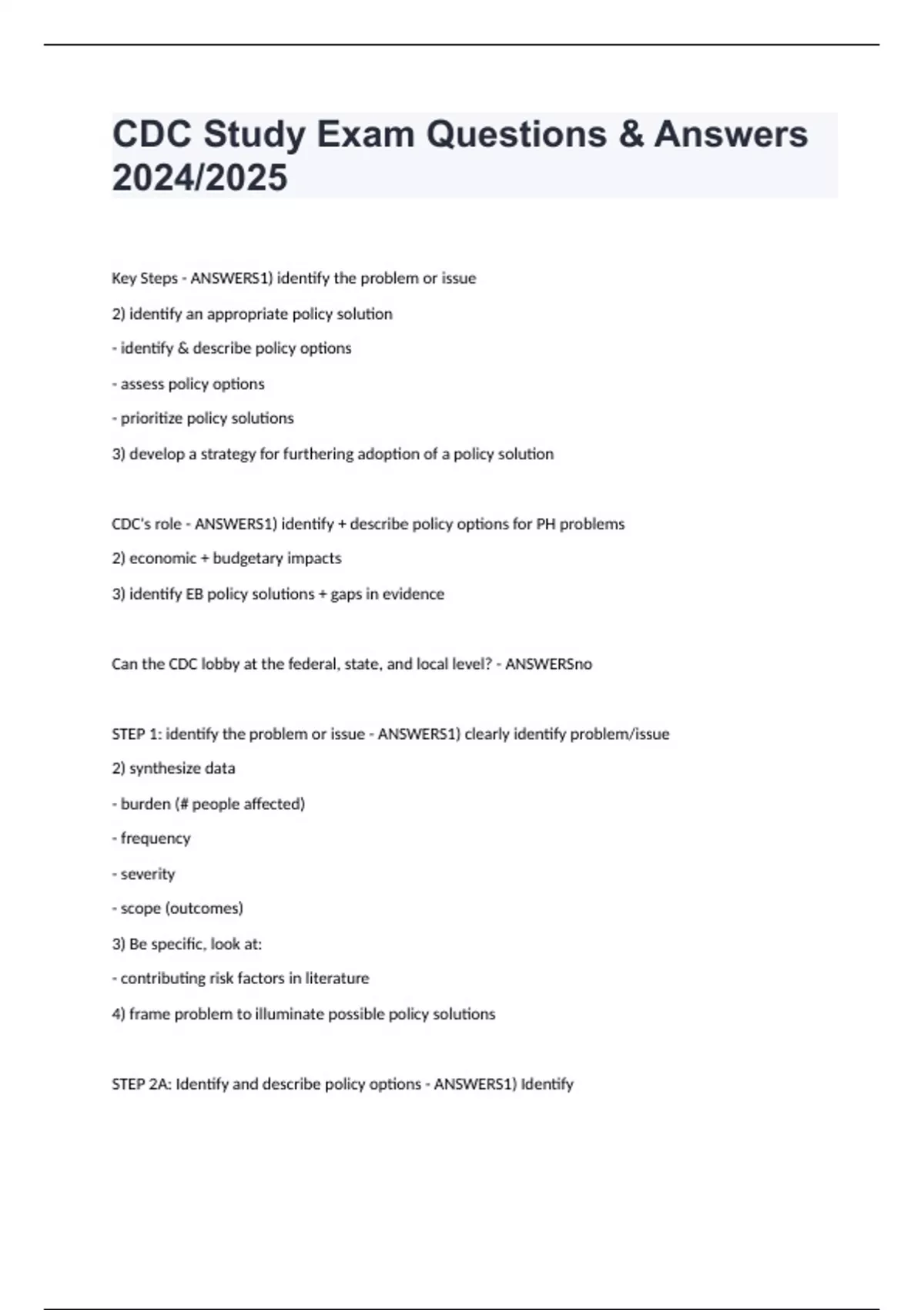 CDC Study Exam Questions & Answers 2024/2025 Key Steps - ANSWERS1) identify the problem or issue 2) identify an appropriate policy solution - identify & describe policy options - assess policy options - prioritize policy solutions 3) develop a strategy for furthering adoption of a policy solution CDC's role - ANSWERS1) identify + describe policy options for PH problems 2) economic + budgetary impacts 3) identify EB policy solutions + gaps in evidence Can the CDC lobby at the federal, state, and local level? - ANSWERSno STEP 1: identify the problem or issue - ANSWERS1) clearly identify problem/issue 2) synthesize data - burden (# people affected) - frequency - severity - scope (outcomes) 3) Be specific, look at: - contributing risk factors in literature 4) frame problem to illuminate possible policy solutions STEP 2A: Identify and describe policy options - ANSWERS1) Identify