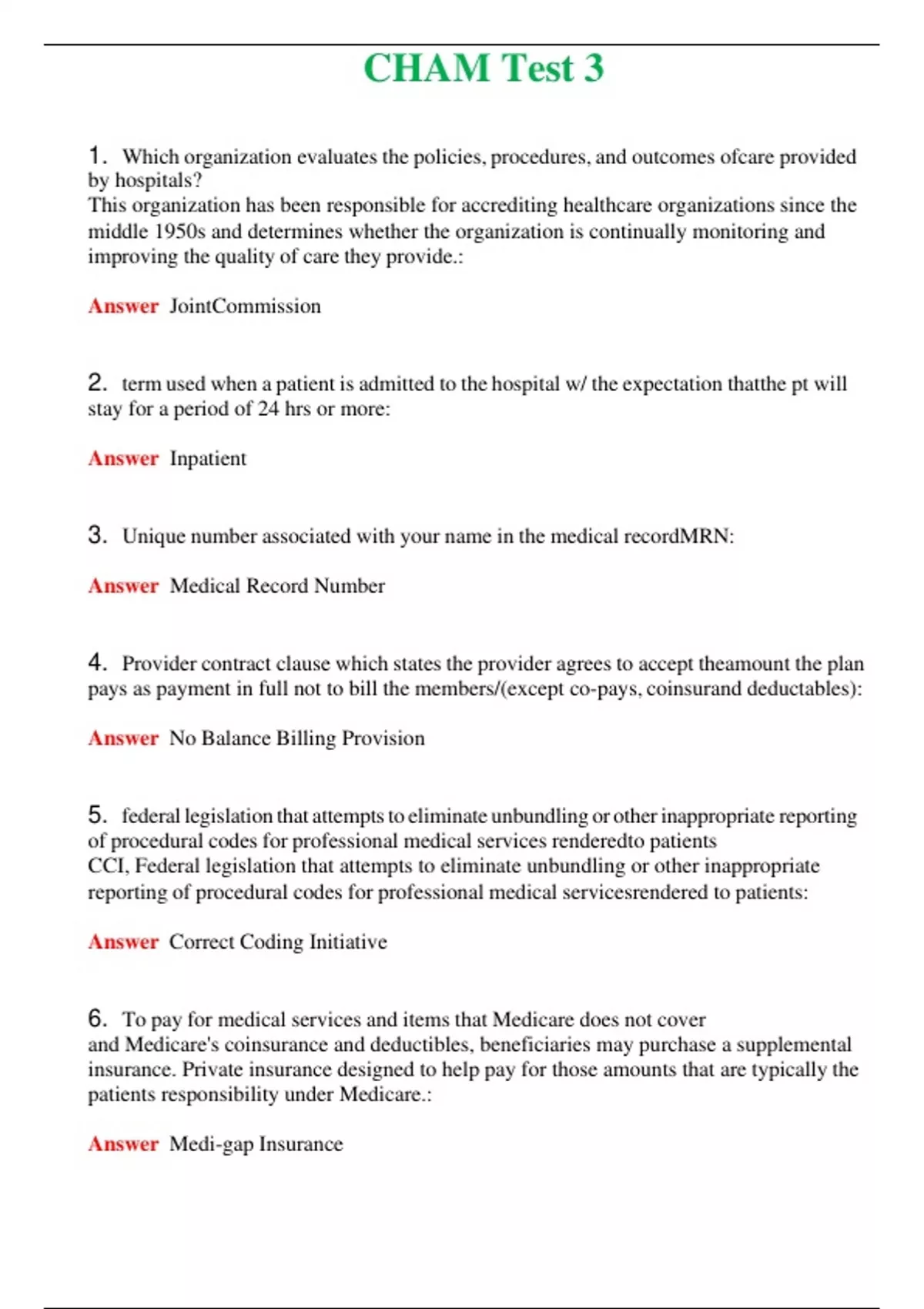 CHAM Test 3 (Latest 2024) Questions With Complete Grade A+ Answers
