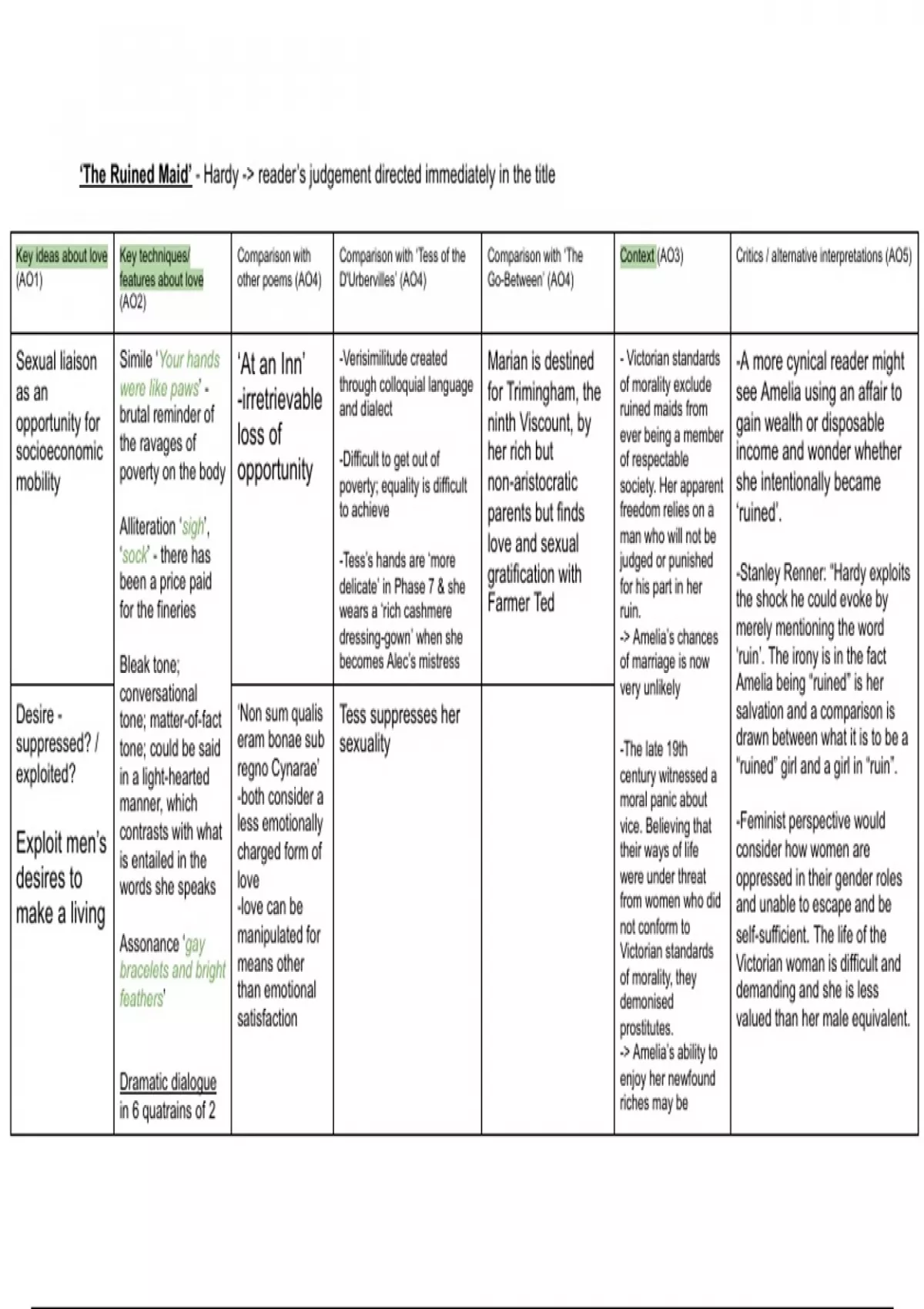 Key ideas about love Key techniques/ Comparison with other poems Comparison with ‘Tess of the D'Urbervilles’ Comparison with ‘The Context (AO3) Critics’ views (AO5)