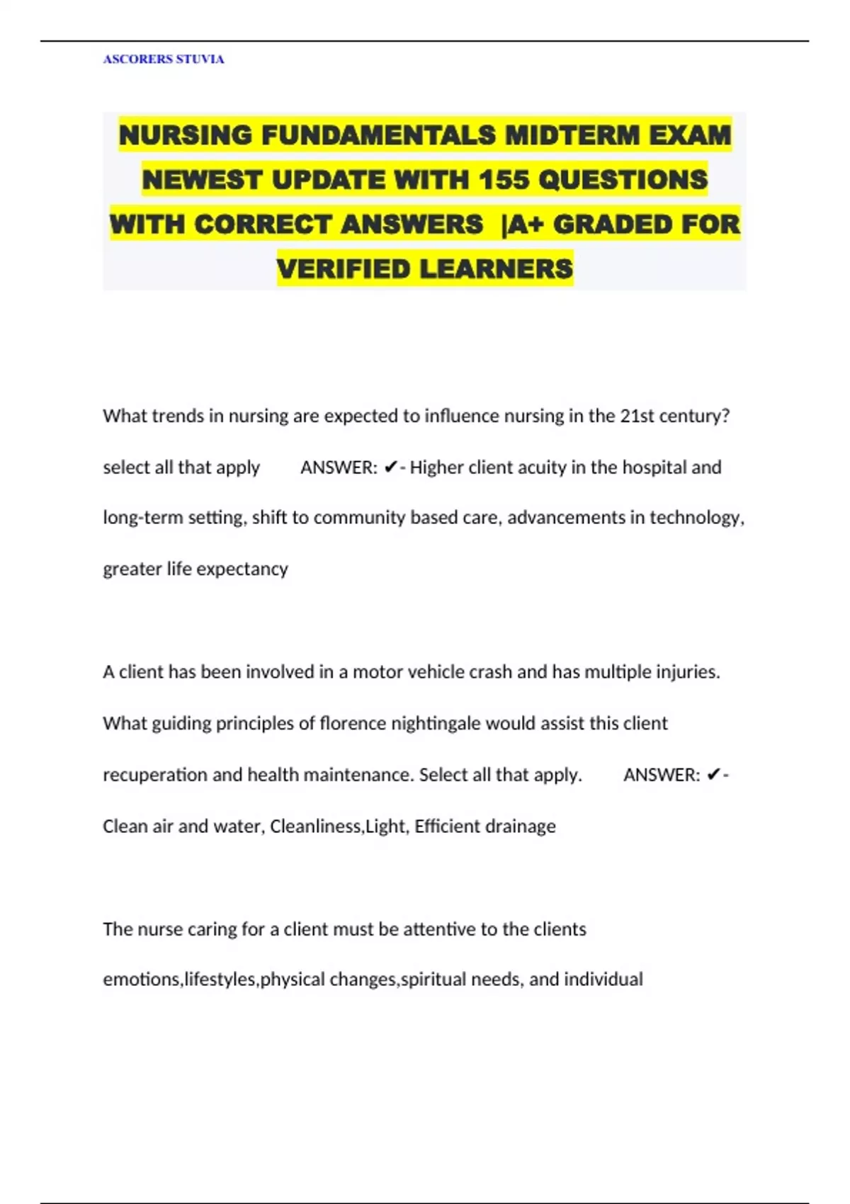 NURSING FUNDAMENTALS MIDTERM EXAM NEWEST UPDATE WITH 155 QUESTIONS WITH CORRECT ANSWERS |A+ GRADED FOR VERIFIED LEARNERS