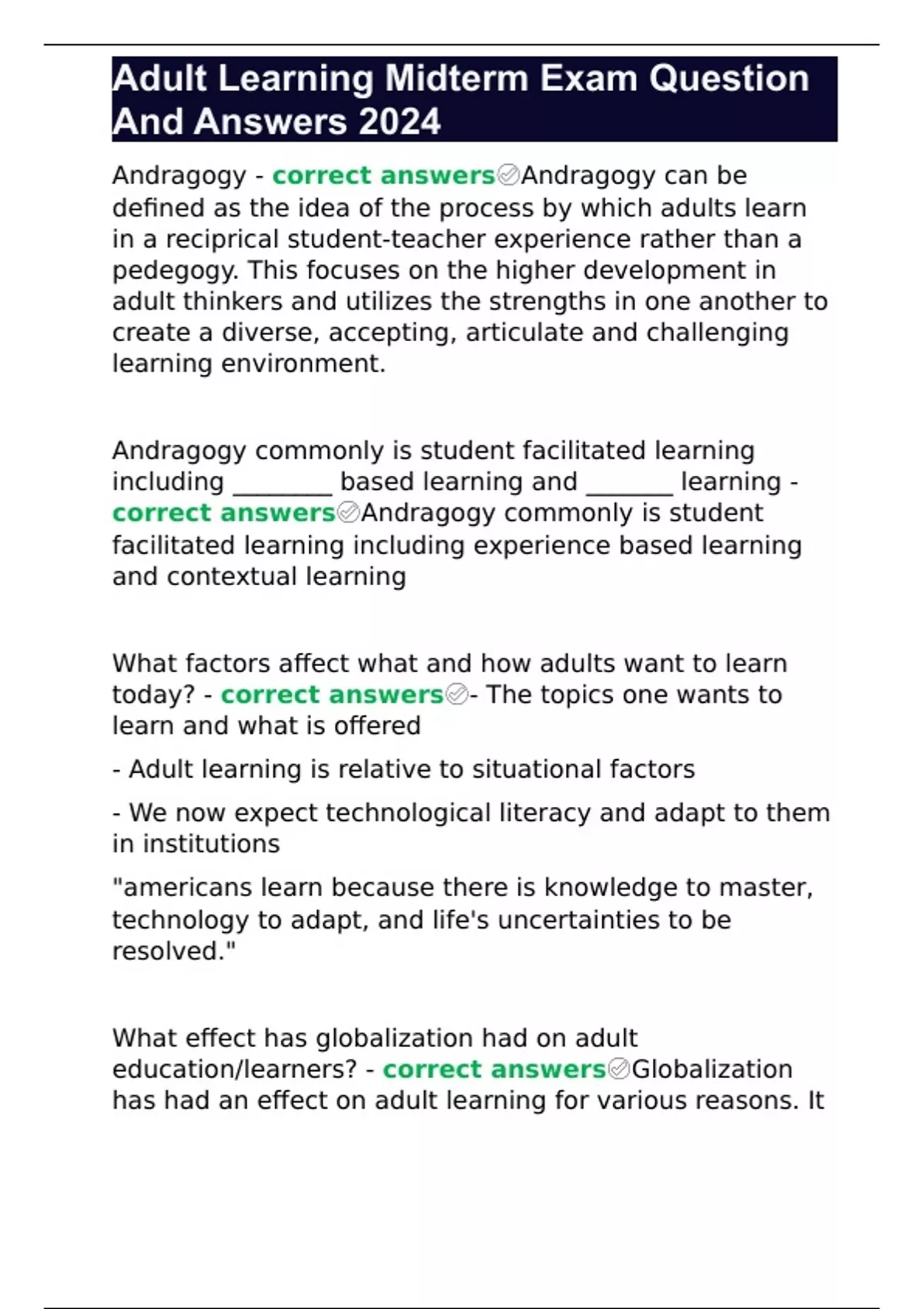 Andragogy - correct answers✅Andragogy can be