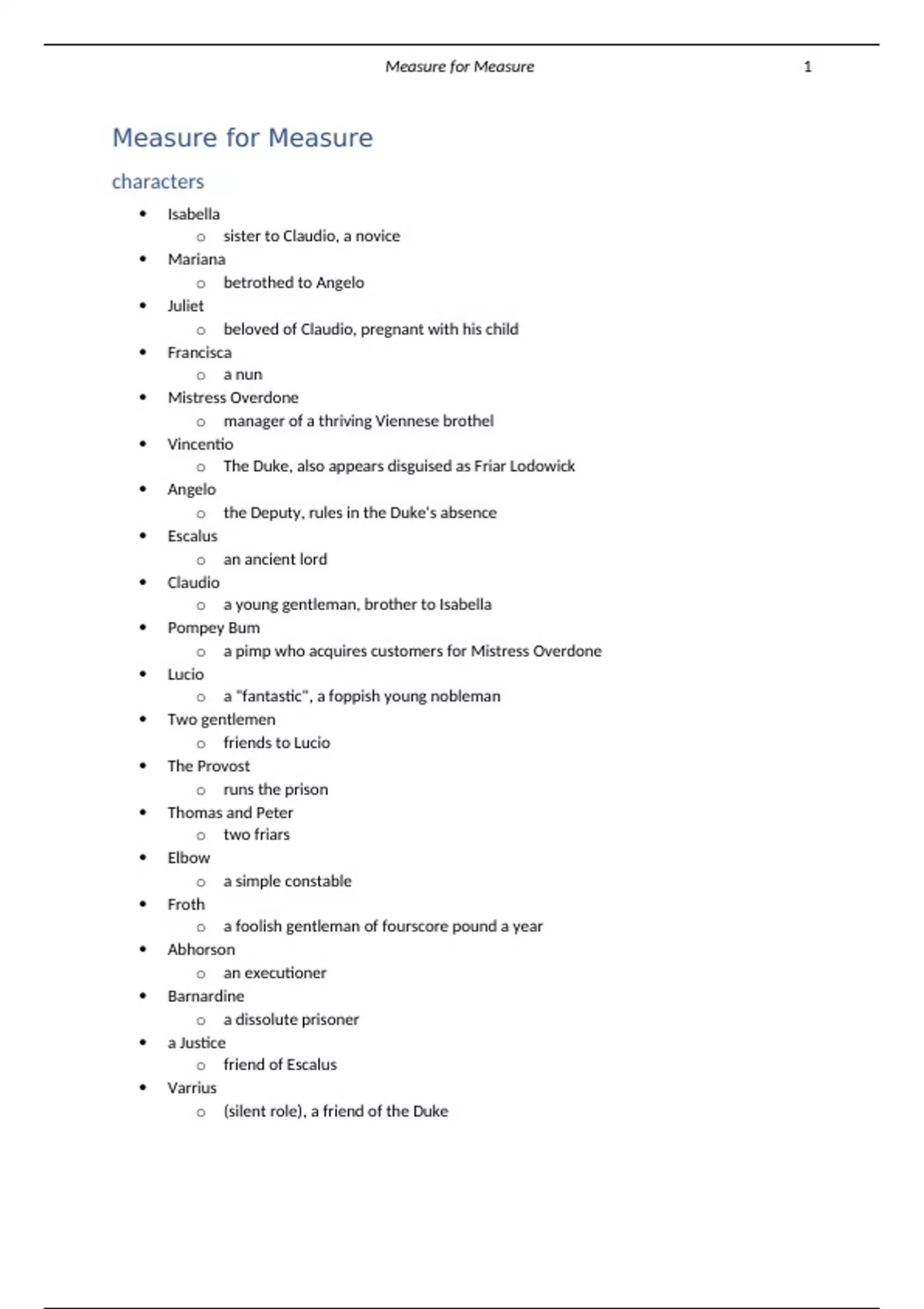 o The Duke, also appears disguised as Friar Lodowick