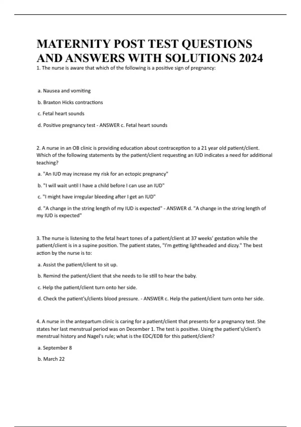 MATERNITY POST TEST QUESTIONS AND ANSWERS WITH SOLUTIONS 2024