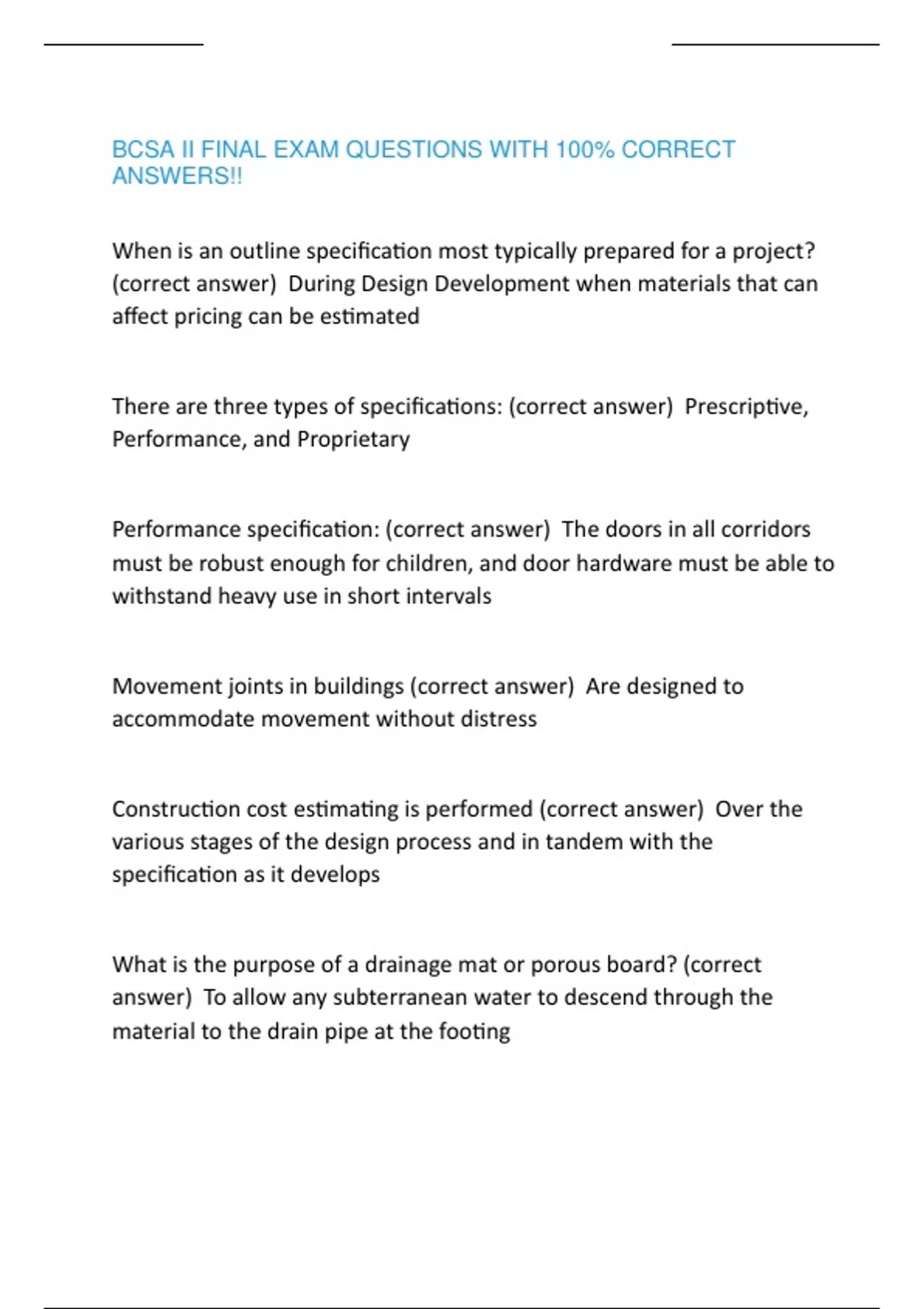 方案,建设一个更加和谐与繁荣的世界 。 好的,我来 为您写一段中文长文 : BCSA II FINAL EXAM QUESTIONS WITH 100% CORRECT ANSWERS!! When is an outline specification most typically prepared for a project? (correct answer) During Design Development when materials that can affect pricing can be estimated There are three types of specifications: (correct answer) Prescriptive, Performance, and Proprietary Performance specification: (correct answer) The doors in all corridors must be robust enough for children, and door hardware must be able to withstand heavy use in short intervals Movement joints in buildings (correct answer) Are designed to accommodate movement without distress Construction cost estimating is performed (correct answer) Over the various stages of the design process and in tandem with the specification as it develops What is the purpose of a drainage mat or porous board? (correct answer) To allow any subterranean water to descend through the material to the drain pipe at the footing 好的,我来 为您写一段中文长文 : 在这个多元化和全球化的时代,我们面临着许多挑战