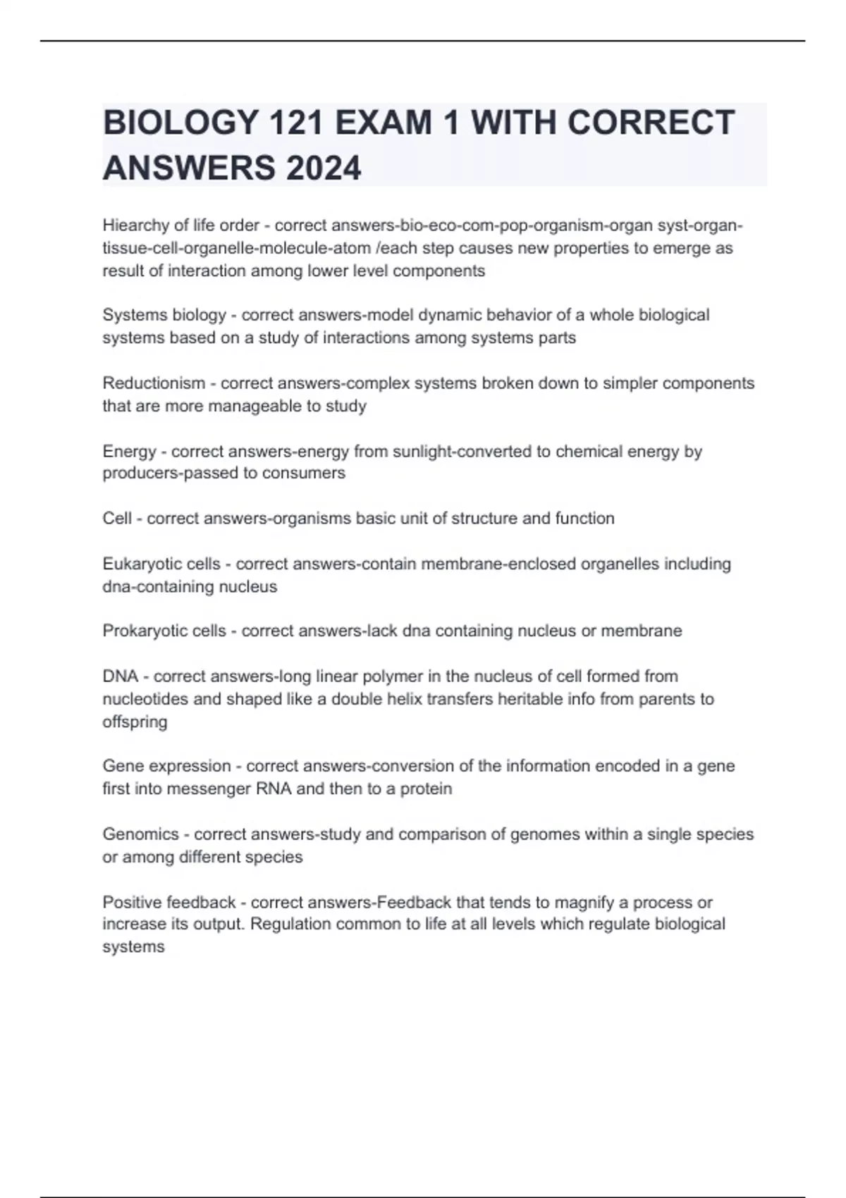 BIOLOGY 121 EXAM 1 WITH CORRECT