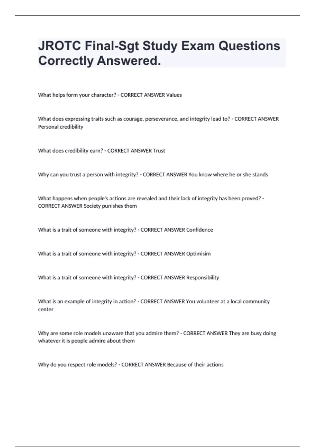JROTC Final-Sgt Study Exam Questions Correctly Answered. What helps form your character? - CORRECT ANSWER Values What does expressing traits such as courage, perseverance, and integrity lead to? - CORRECT ANSWER Personal credibility What does credibility earn? - CORRECT ANSWER Trust Why can you trust a person with integrity? - CORRECT ANSWER You know where he or she stands What happens when people's actions are revealed and their lack of integrity has been proved? - CORRECT ANSWER Society punishes them What is a trait of someone with integrity? - CORRECT ANSWER Confidence What is a trait of someone with integrity? - CORRECT ANSWER Optimisim What is a trait of someone with integrity? - CORRECT ANSWER Responsibility What is an example of integrity in action? - CORRECT ANSWER You volunteer at a local community center Why are some role models unaware that you admire them? - CORRECT ANSWER They are busy doing whatever it is people admire about them Why do you respect role models? - CORRECT ANSWER Because of their actions What did Aristotle believe you are worthy of if you're good at what you do? - CORRECT ANSWER Others respect and admiration What was the most important indication indication of a person's character according to Aristotle? - CORRECT ANSWER Excellence in action