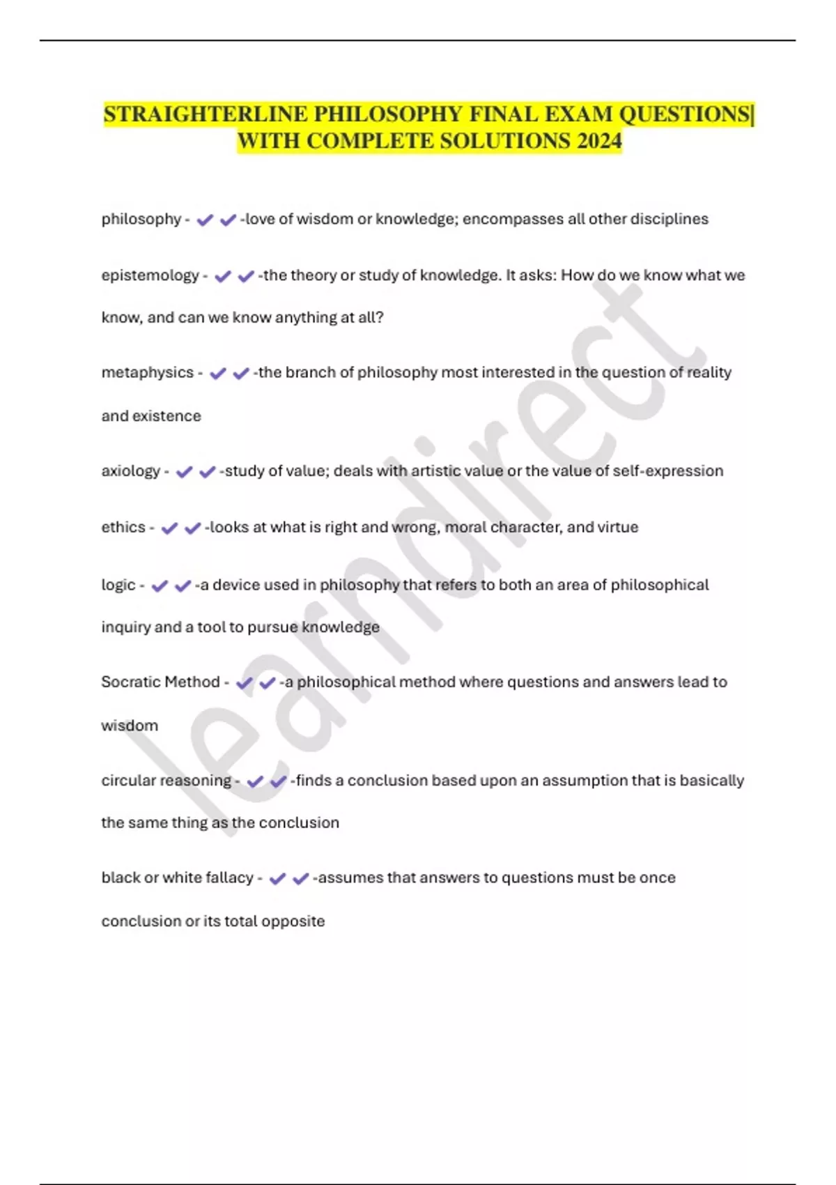STRAIGHTERLINE PHILOSOPHY FINAL EXAM QUESTIONS| WITH COMPLETE SOLUTIONS 2024 philosophy - -love of wisdom or knowledge; encompasses all other disciplines epistemology - -the theory or study of knowledge. It asks: How do we know what we know, and can we know anything at all? metaphysics - -the branch of philosophy most interested in the question of reality and existence axiology - -study of value; deals with artistic value or the value of self-expression ethics - -looks at what is right and wrong, moral character, and virtue logic - -a device used in philosophy that refers to both an area of philosophical inquiry and a tool to pursue knowledge Socratic Method - -a philosophical me