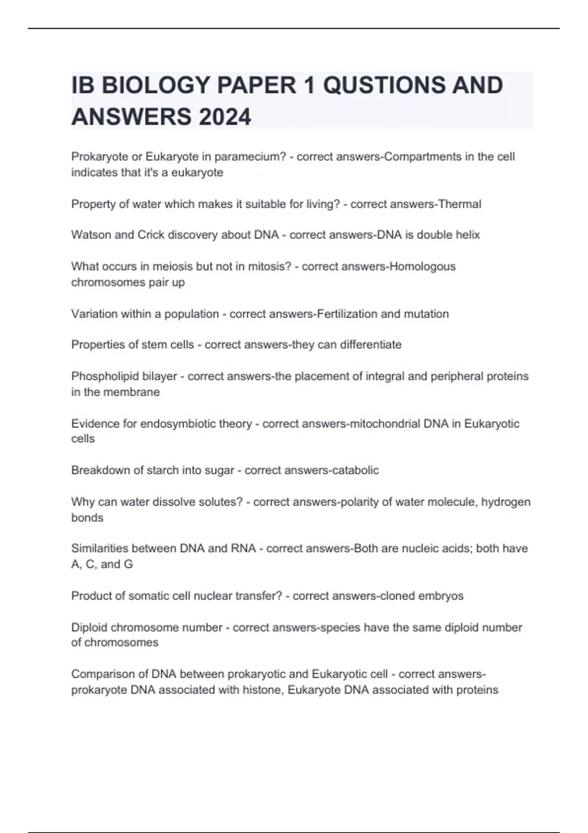 IB BIOLOGY PAPER 1 QUSTIONS AND ANSWERS 2024