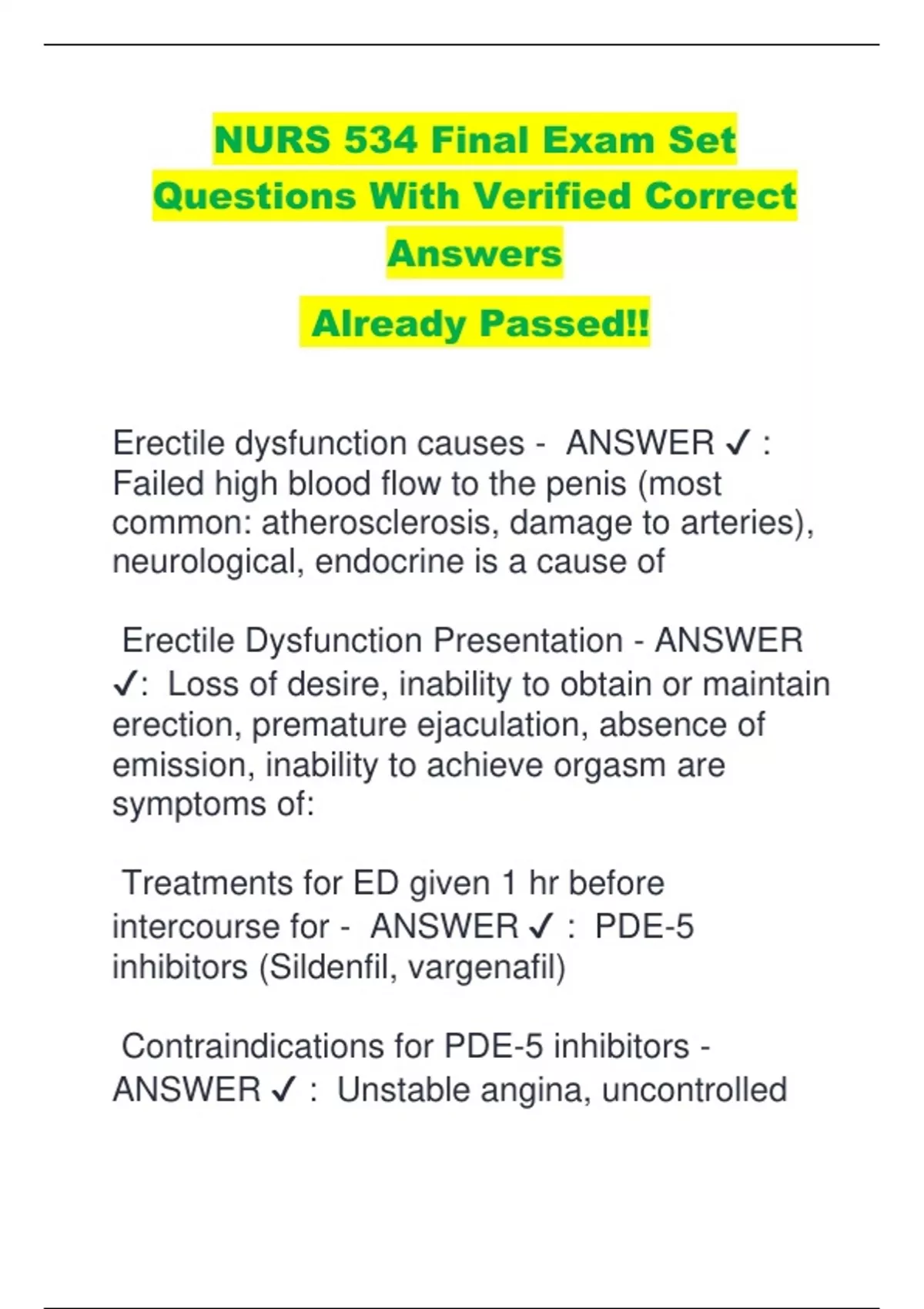 NURS 534 Final Exam Set Questions With Verified Correct Answers Already Passed!! Erectile dysfunction causes - ANSWER : Failed high blood flow to the penis (most common: atherosclerosis, damage to arteries), neurological, endocrine is a cause of Erectile Dysfunction Presentation - ANSWER : Loss of desire, inability to obtain or maintain erection, premature ejaculation, absence of emission, inability to achieve orgasm are symptoms of: Treatments for ED given 1 hr before intercourse for - ANSWER : PDE-5 inhibitors (Sildenfil, vargenafil) Contraindications for PDE-5 inhibitors - ANSWER : Unstable angina, uncontrolled hypertension, CHF, MI w/in 2 weeks, high risk arrythmia's, obstructive cardiomyopathies Hydrocele, varicocele, epididymitis, prostatitis, testicular torsion, hernia are differential diagnoses for: - ANSWER : Testicular Pain The absence of the cremasteric reflex is a medical emergency indicating - ANSWER : Testicular Torsion