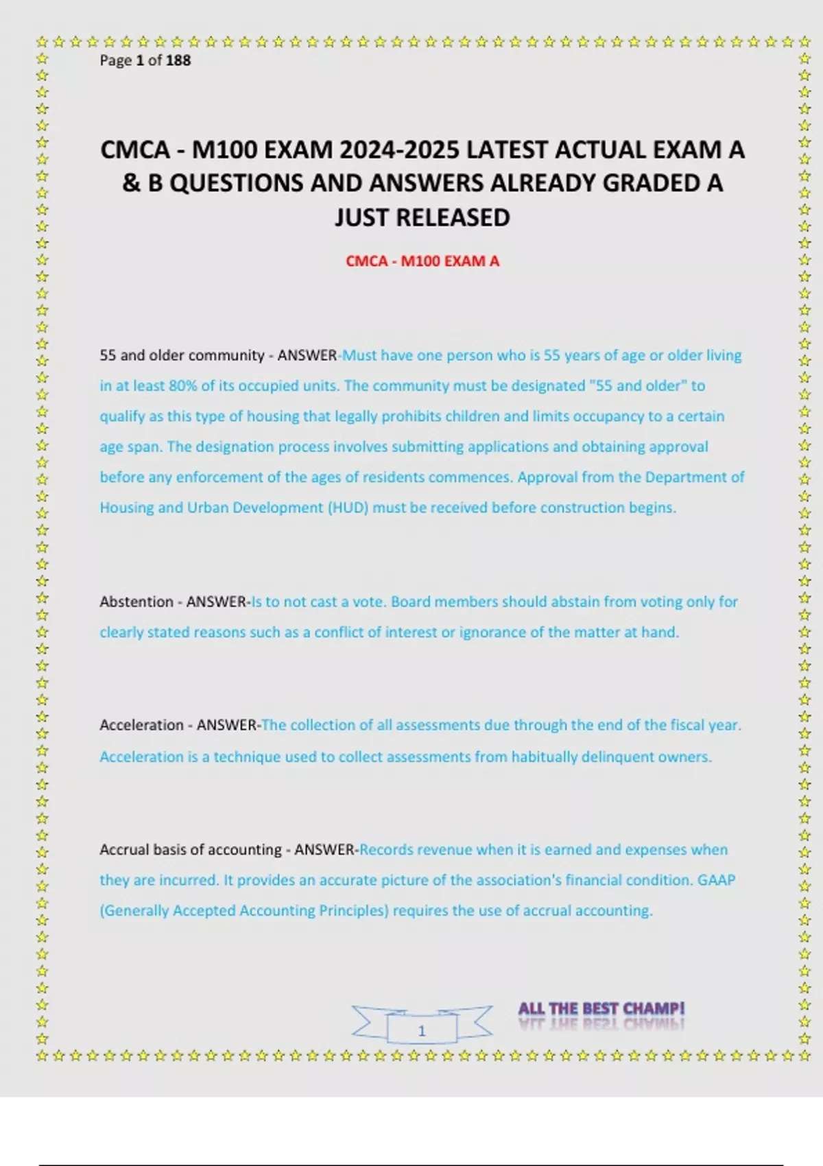 CMCA - M100 EXAM LATEST ACTUAL EXAM A & B QUESTIONS AND ANSWERS ALREADY GRADED A JUST RELEASED