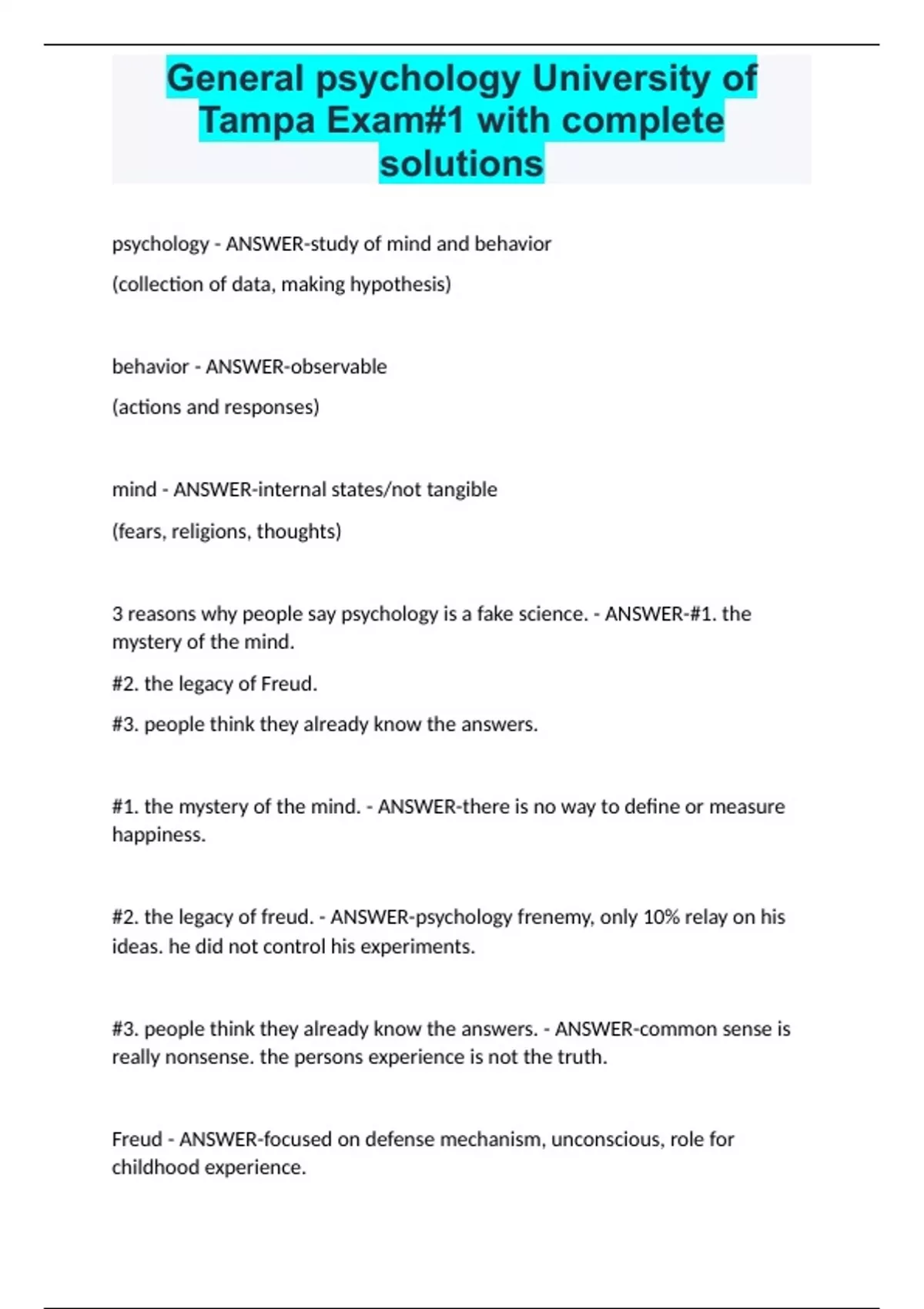 General psychology University of Tampa Exam#1 with complete solutions.