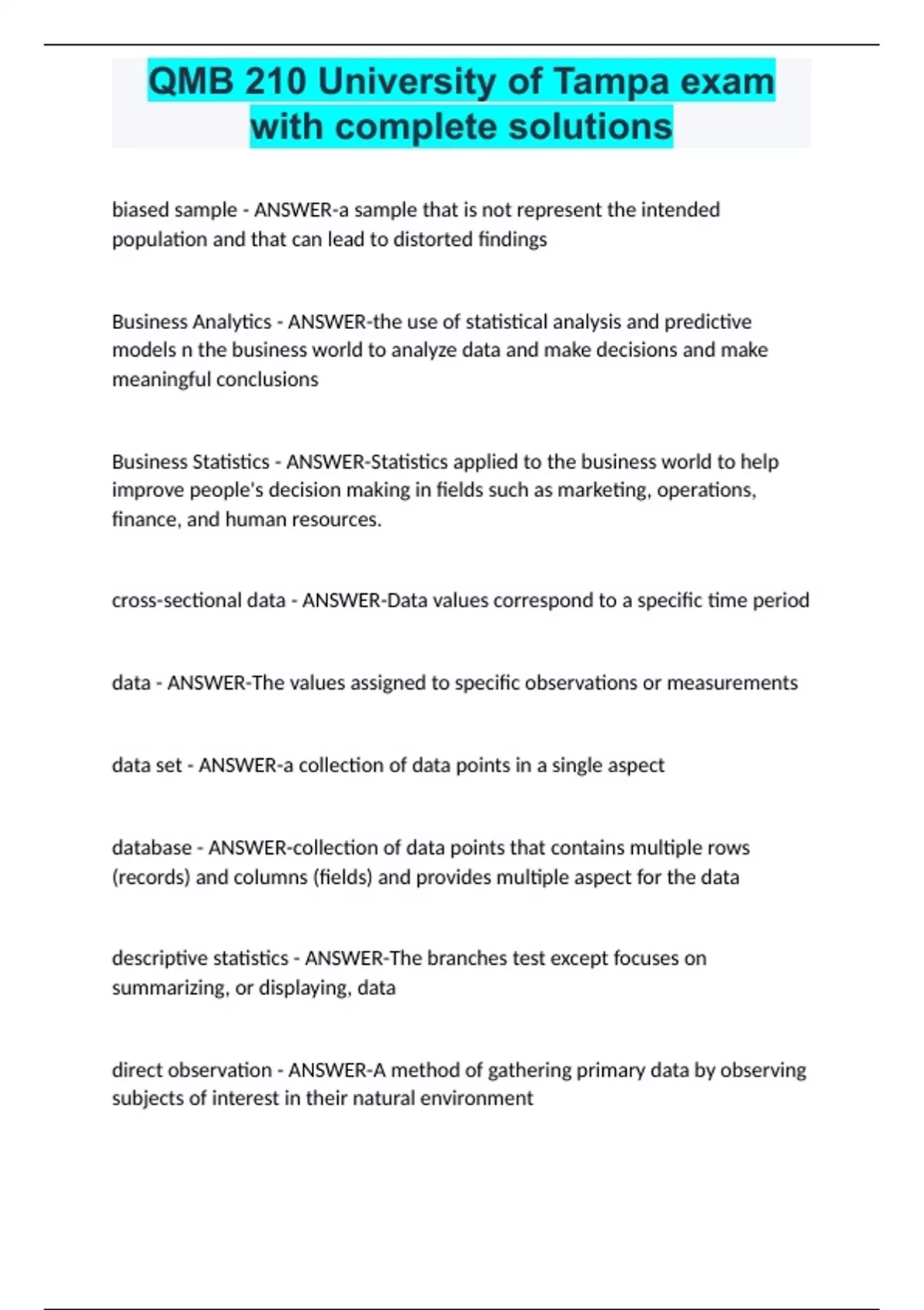 QMB 210 University of Tampa exam with complete solutions