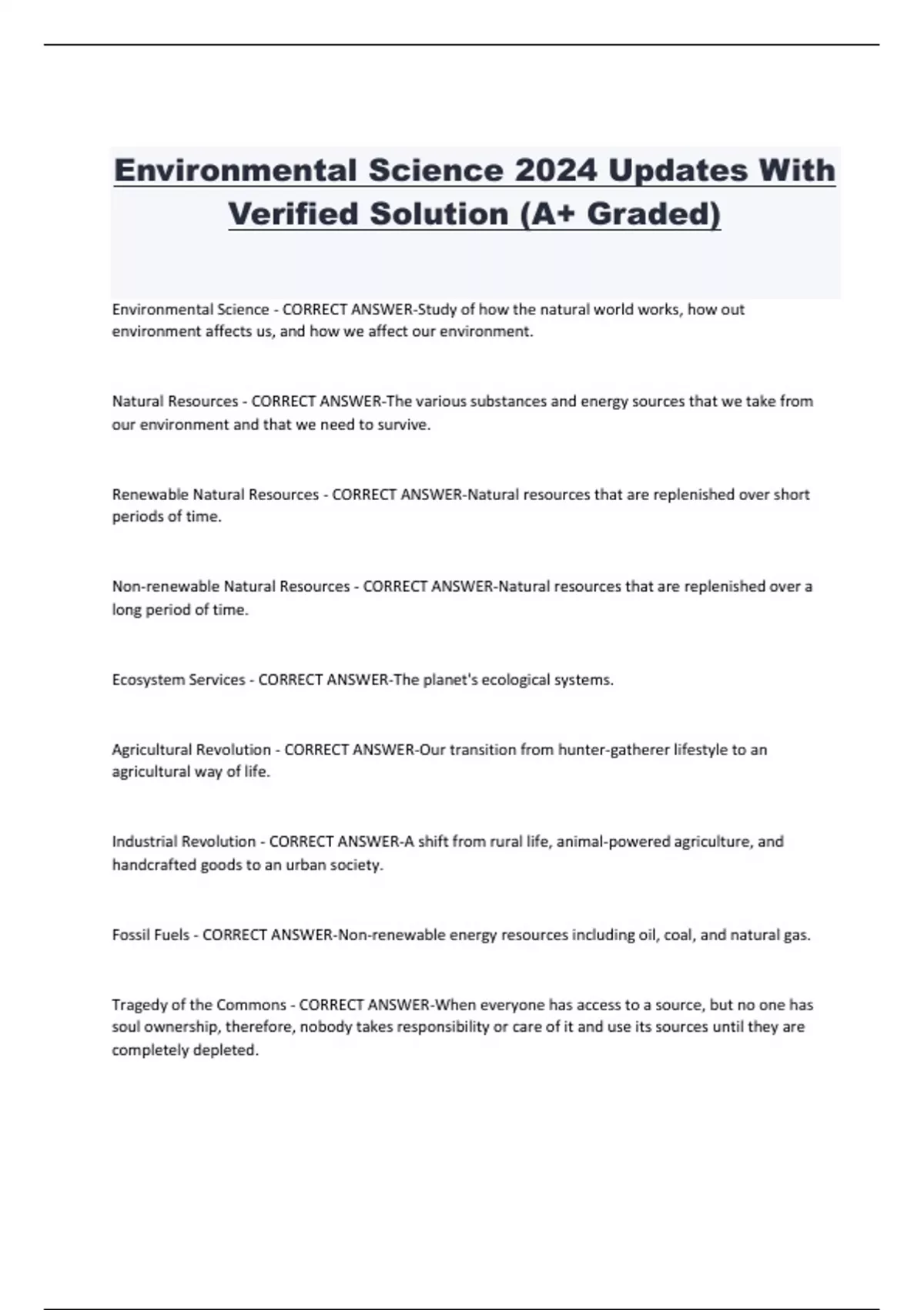 Environmental Science 2024 Updates With Verified Solution (A+ Graded) Environmental Science - CORRECT ANSWER-Study of how the natural world works, how out environment affects us, and how we affect our environment. Natural Resources - CORRECT ANSWER-The various substances and energy sources that we take from our environment and that we need to survive. Renewable Natural Resources - CORRECT ANSWER-Natural resources that are replenished over short periods of time.