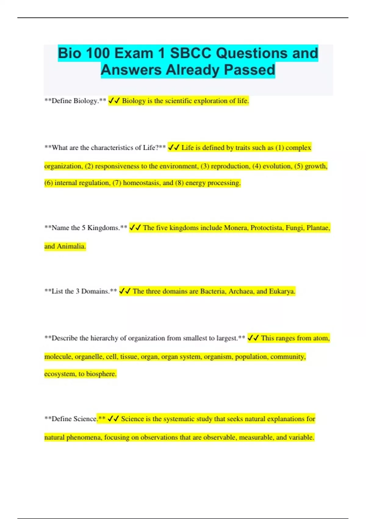 Bio 100 Exam 1 SBCC Questions and Answers Already Passed **Define Biology.** Biology is the scientific exploration of life. **What are the characteristics of Life?** Life is defined by traits such as (1) complex organization, (2) responsiveness to the environment, (3) reproduction, (4) evolution, (5) growth, (6) internal regulation, (7) homeostasis, and (8) energy processing. **Name the 5 Kingdoms.** The five kingdoms include Monera, Protoctista, Fungi, Plantae, and Animalia. **List the 3 Domains.** The three domains are Bacteria, Archaea, and Eukarya. **Describe the hierarchy of organization from smallest to largest.** This ranges from atom, molecule, organelle, cell, tissue, organ, organ system, organism, population, community, ecosystem, to biosphere. **Define Science.** Science is the systematic study that seeks natural explanations for natural phenomena, focusing on observations that are observable, measurable, and variable. **Differentiate Discovery Science from Hypothesis-based Science.** Discovery Science involves describing natural phenomena, while Hypothesis-based Science applies the scientific method. **List the steps of the Scientific Method.** These steps are (1) Observation, (2) Formulation of a Question, (3) Hypothesis Development, (4) Prediction, and (5) Testing. **Define Matter.** Matter encompasses substances that possess mass and occupy space. **Define Element.** An element constitutes a substance that cannot be reduced to simpler substances. **Name the Essential Elements of Life.** These are carbon, hydrogen, oxygen, and nitrogen. **Define Atom.** An atom represents the fundamental unit of an element. **Explain Atomic Number.** The atomic number denotes the count of protons within an atom's nucleus, uniquely defining its element. **Define Atomic Mass.** Atomic mass signifies the combined total of protons and neutrons within an atom's nucleus. **Describe Electron Shells.** Electron shells are the designated regions surrounding the nucleus where electrons are located, capable of hosting either two or eight electrons. **Differentiate Inert and Reactive Atoms.** Inert atoms feature complete outer electron shells, while reactive atoms possess incomplete outer shells and are predisposed to bond formation. **Define Chemical Bond.** A chemical bond pertains to the interaction between atoms that results in the attainment of a complete outer electron shell, involving the transfer, reception, or sharing of electrons. **Define Ionic Bond.** An ionic bond is established through